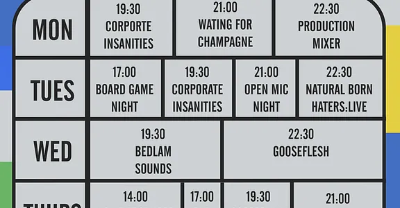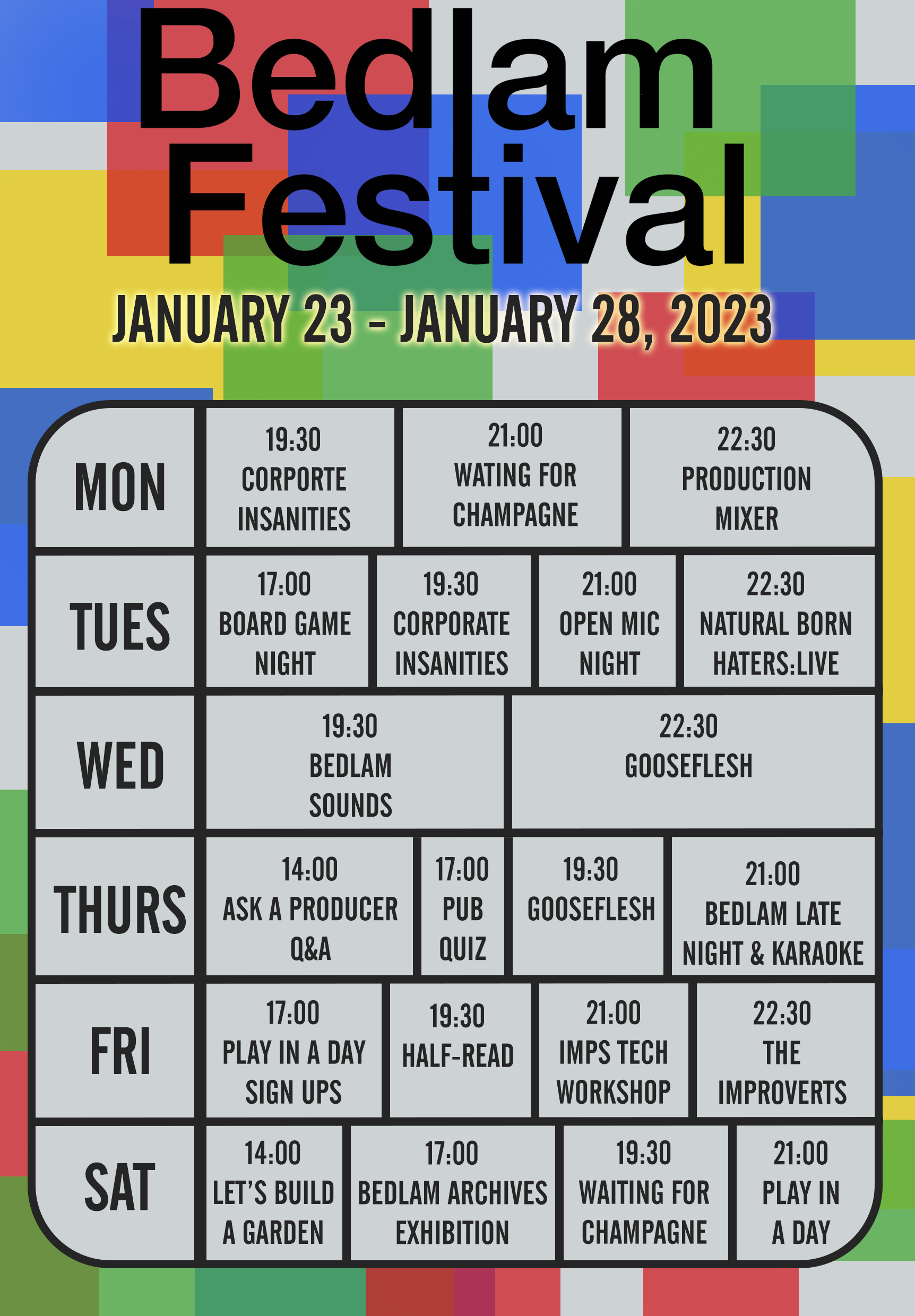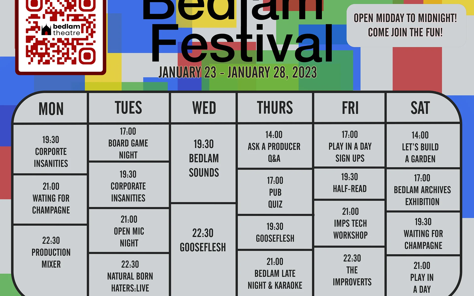 The annual celebration of Bedlam. Open all week midday to midnight