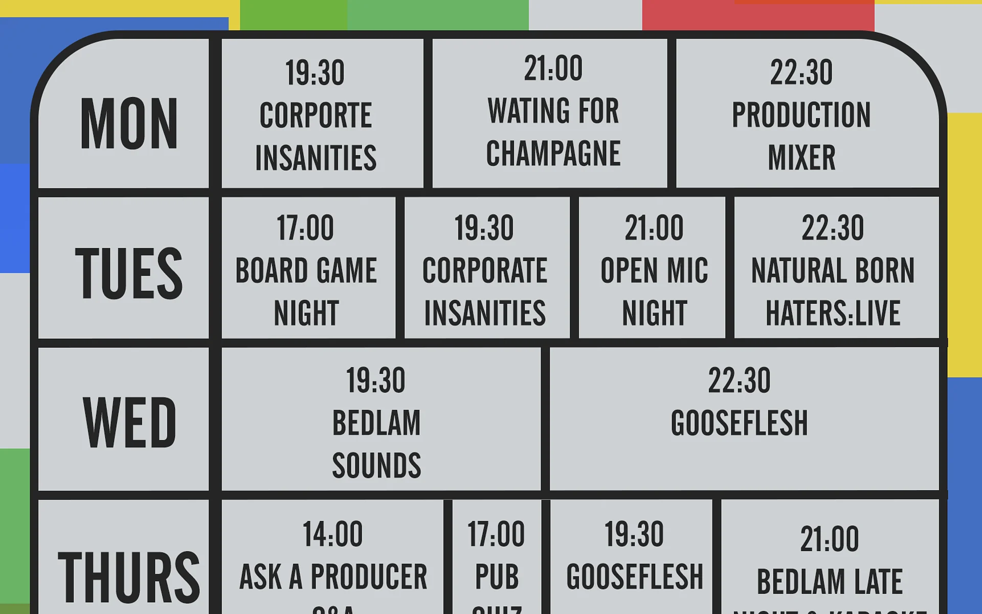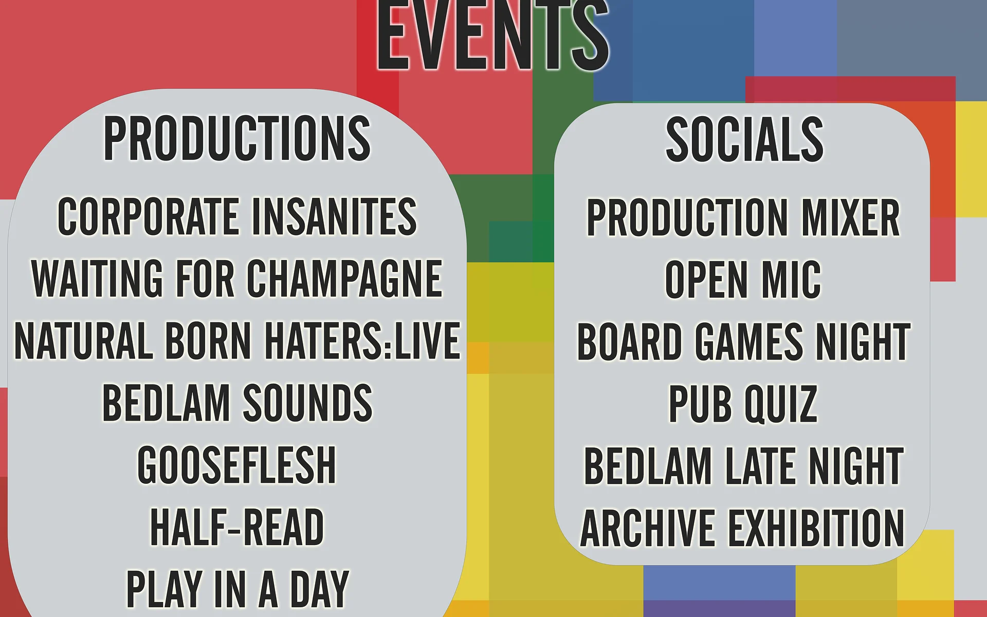 From comedy to tragedy, original writing to big name shows, Bedlam will make you laugh, make you cry, and make you want to come back for more!
