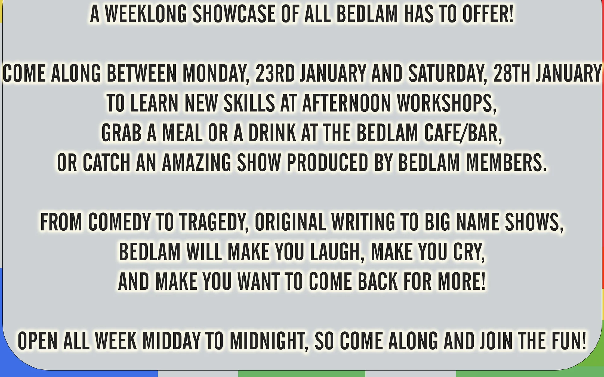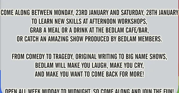 Come along between Monday, 23rd January and Saturday, 28th January to learn new skills at afternoon workshops, grab a meal or a drink at the Bedlam Cafe/Bar, or catch an amazing show produced by Bedlam members.