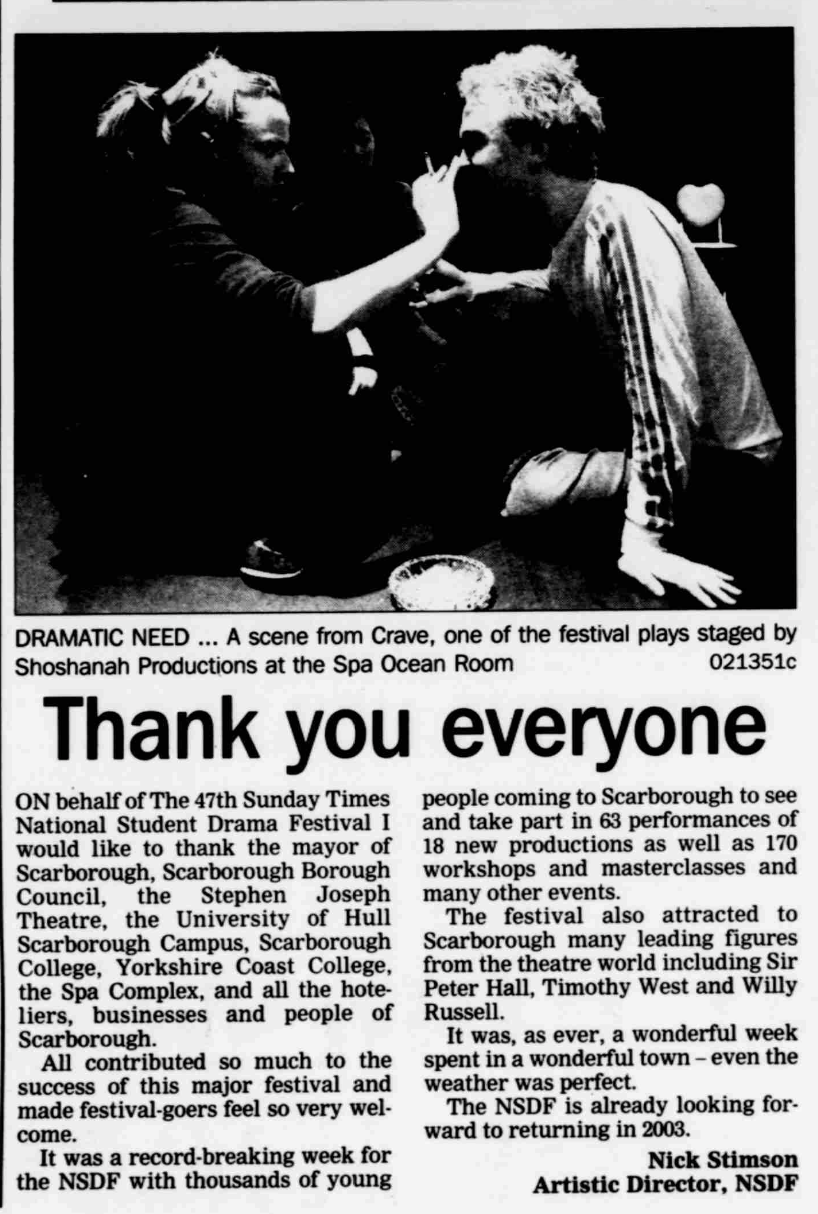 The 2002 Festival was a huge success. With a keynote address from Sir Peter Hall, the Festival hit the ground running. Workshops included: Timothy West, Tom Morris, Lindsay Posner, Vayu Naidu, Willy Russell, David Hunter, Amani Naphtali and Isobel Hawson. NSDF02 also saw the launch of the NSDF Ensemble which culminated in a new production, The Rage of Achilles, and a production from the Festival, Longwave, being shown at the Birmingham Rep and Bath Arts Centre.