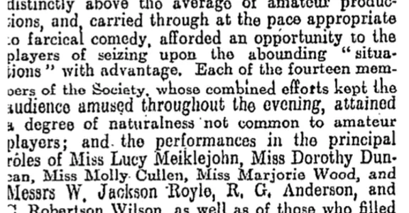 The Yahoo Orchestra, conducted by Mr F. M. Collinson, played selections before the curtain rose and during the intervals between the acts.