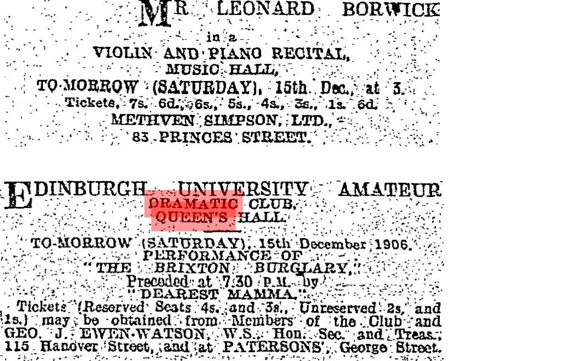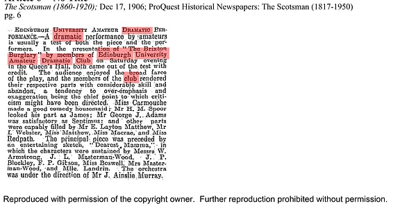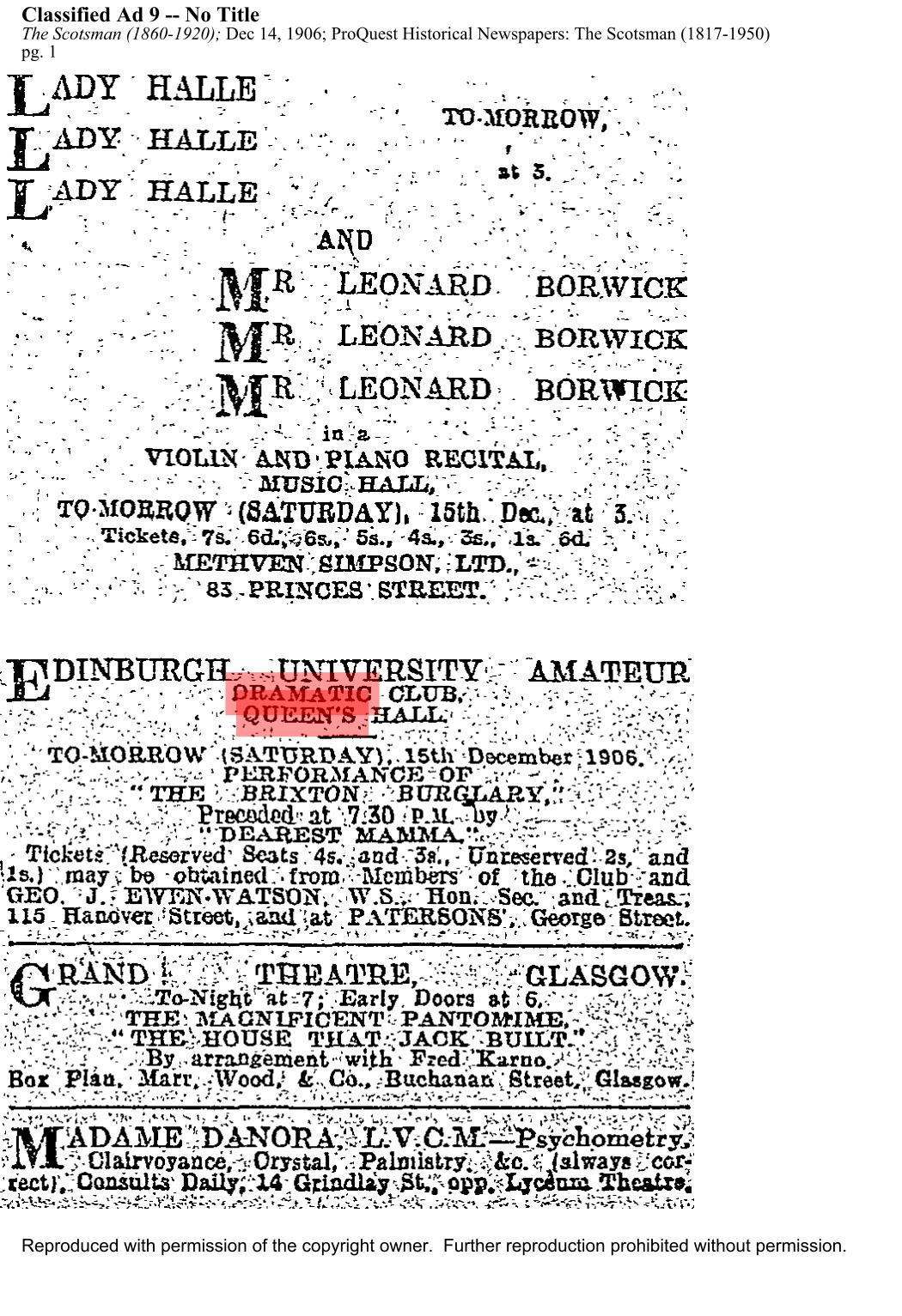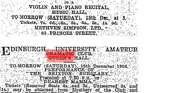 This double bill was also performed on the 18th at the Craiglockhart Hydropathic.