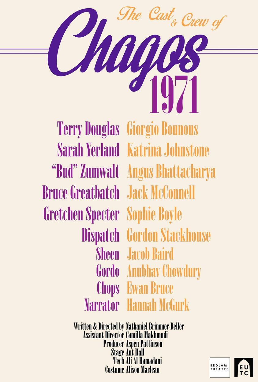 The Thick of It meets imperial history. And, believe it or not, a true story. You won’t believe your eyes. In a Parliament building in April 1971, five government reps were tasked with a surreal mission: find a way to clear 2,000 indigenous people off the Chagos Archipelago, in the Indian Ocean. What they decided is so absurd you may not believe it, but this here is a true story. A new play for Bedlam Festival 2019 penned by Nathaniel Brimmer-Beller, CHAGOS 1971 shines a light on a chapter in history so surprising it’s ridiculous, and so recent it’s still being dealt with today. Come see for yourself!