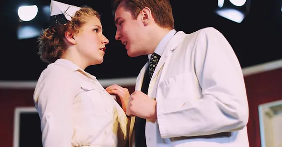 Psychology and psychiatry butt against comic form. It’s not One Flew Over the Cuckoo’s Nest meets Peter Rabbit but it’s there in the wacky sanatorium where Doctors Sanderson, handsome, (Stephen Macleod), and Chumley, crumpled, (Callum O’Dwyer) mess up. Pretty Nurse Kelly (Elsa van der Wal) is stuck in-between them with only the near lunatic, knuckle-dragging Charge Nurse Wilson (Martin Maclennan) for support. Chumley takes to his own couch and fantasises about Akron, a silent young woman – not Mrs Chumley (Rachel Bussum) – beneath maple trees and cold beer. Elwood, bless him, counsels whisky and – progressive fella – that the lady be allowed to talk.