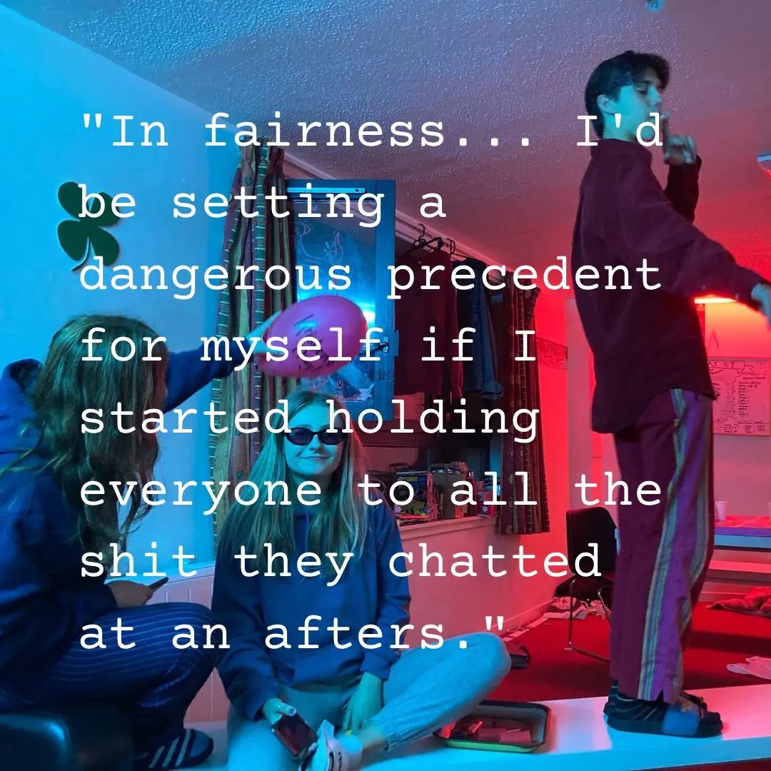 Maeve, Theo, Fabian and Indi are flatmates at university. Last night they went out. This morning they’re paying the price, though no one as much as Maeve. After blacking out, she wakes up on the couch mortified, demanding to know the details. As they each contribute to piecing together the night - out of order and through their own eyes - Theo eventually stumbles upon a realisation that changes everything.