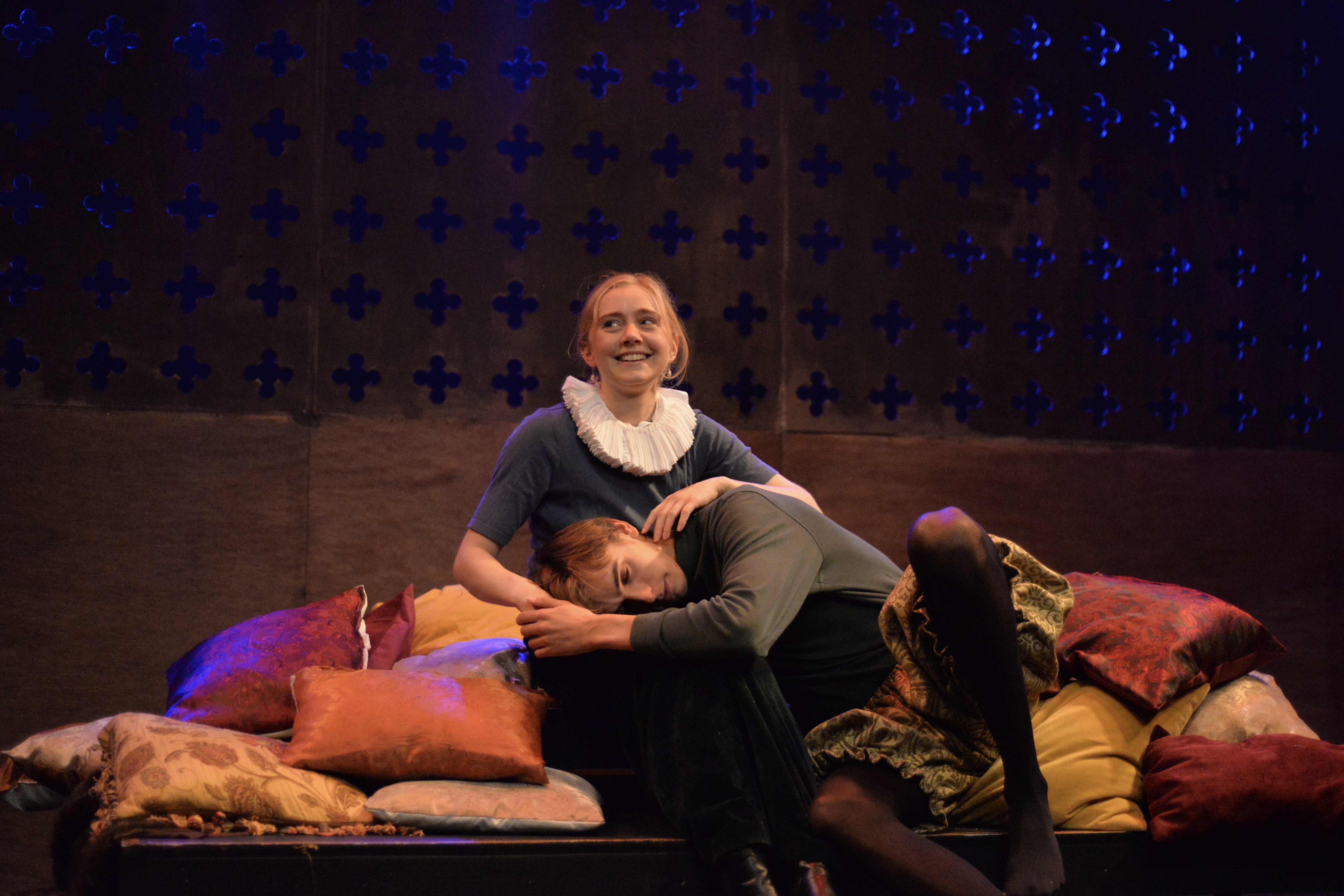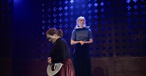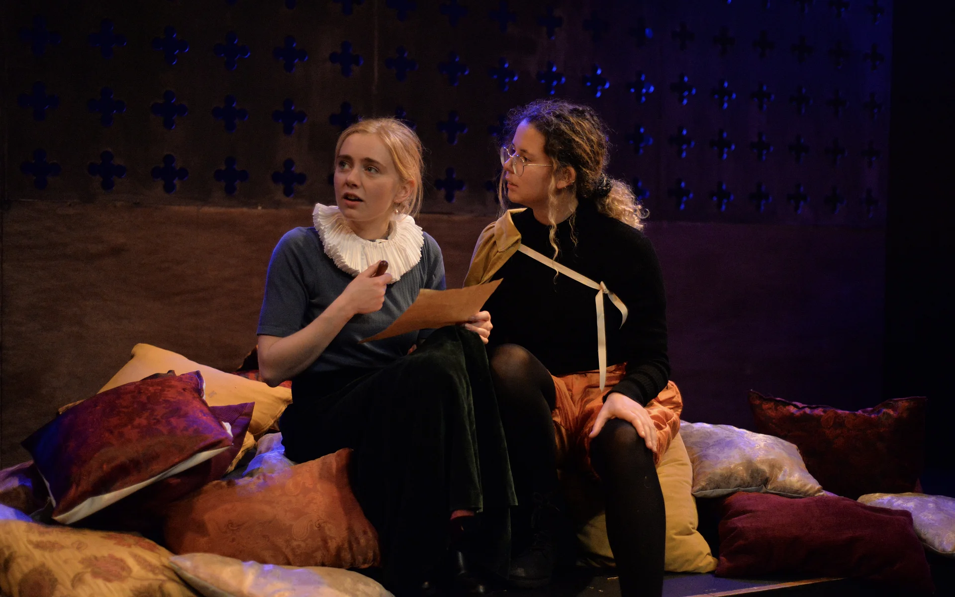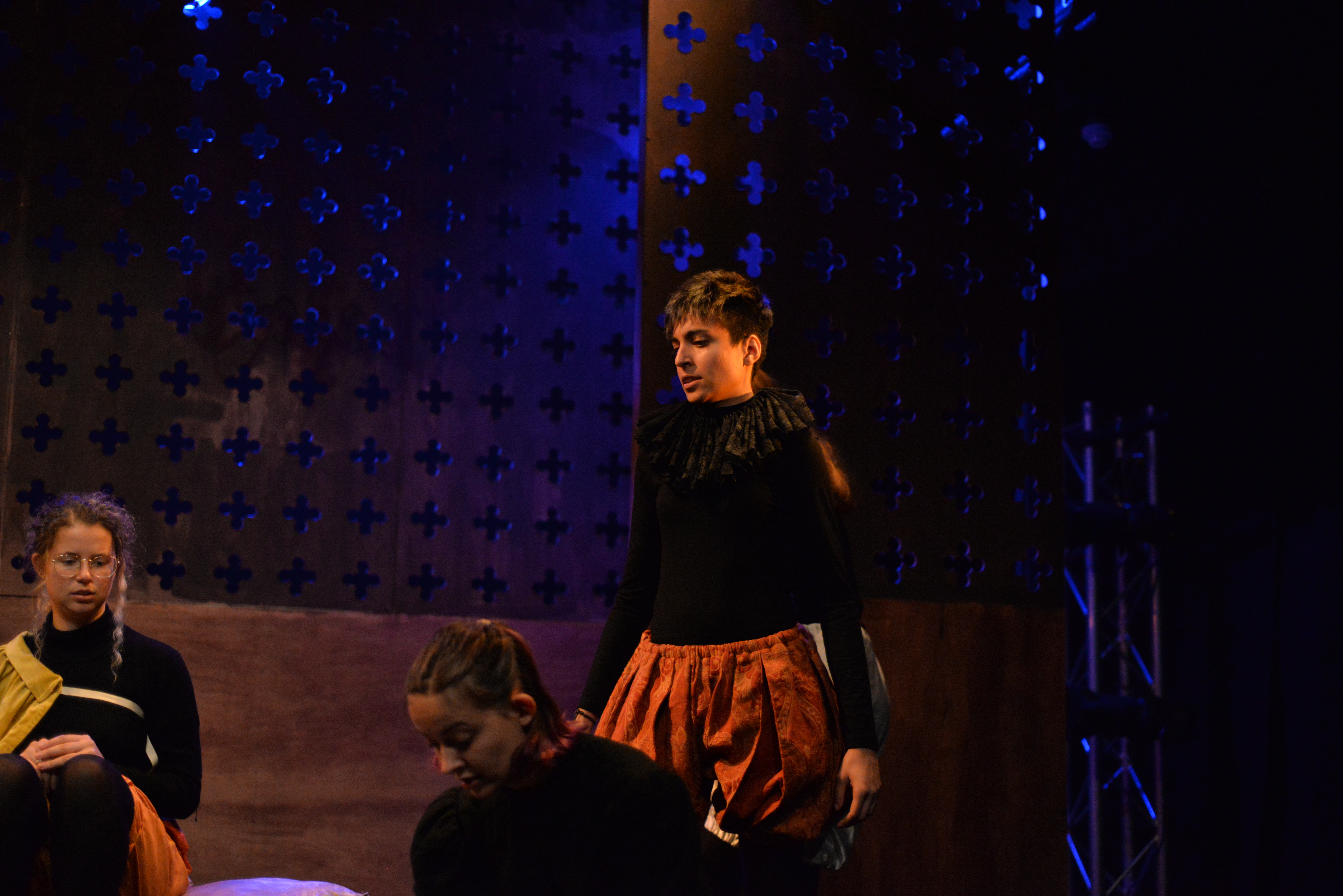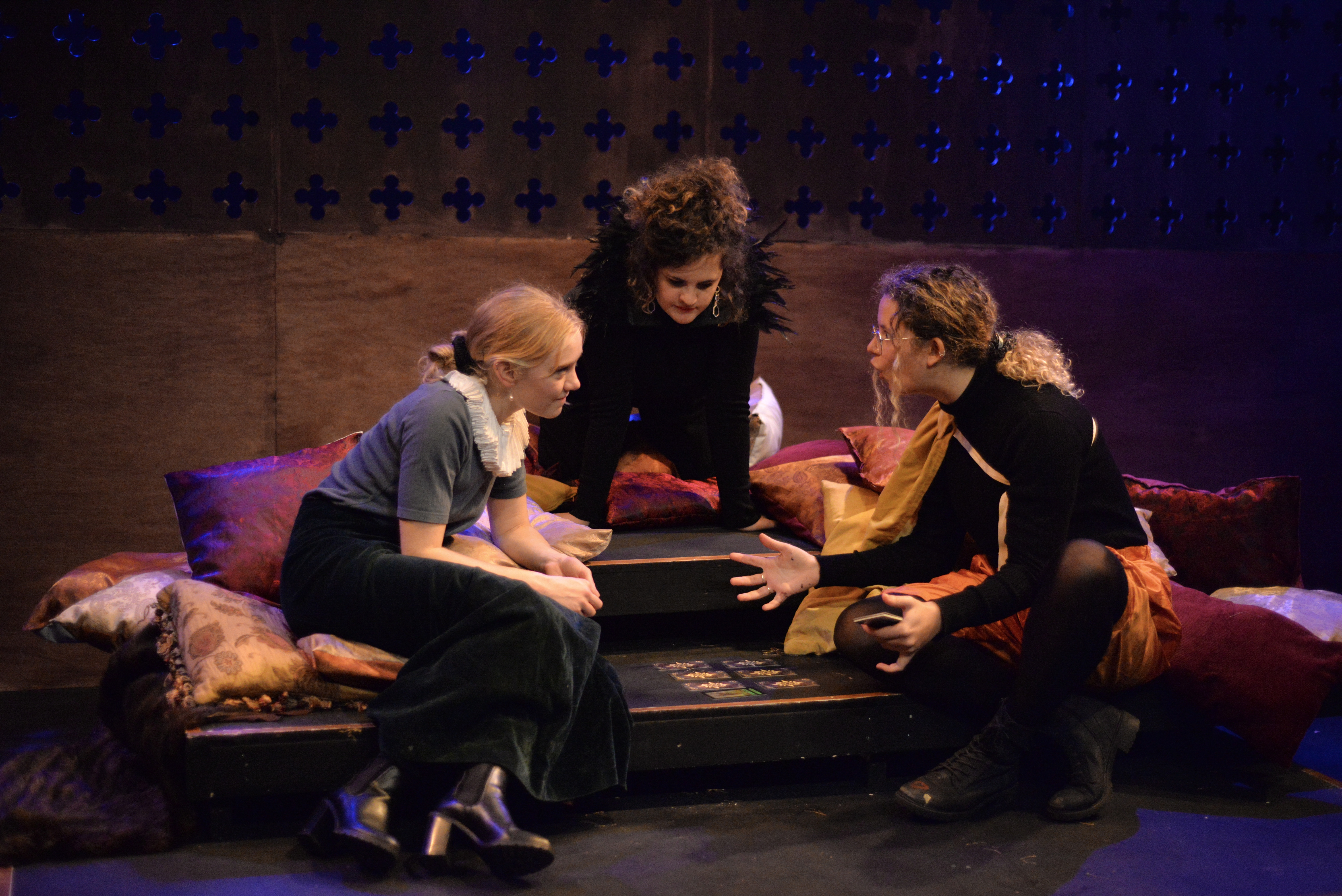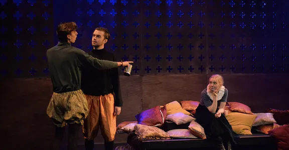 Indeed, Matthew Marshland’s clever design that makes great use of the Bedlam space, allowing the players to come right out into the audience so they are, at times, addressing them directly from the front row. It is lit with a great sense of atmosphere by Elissa Webb.