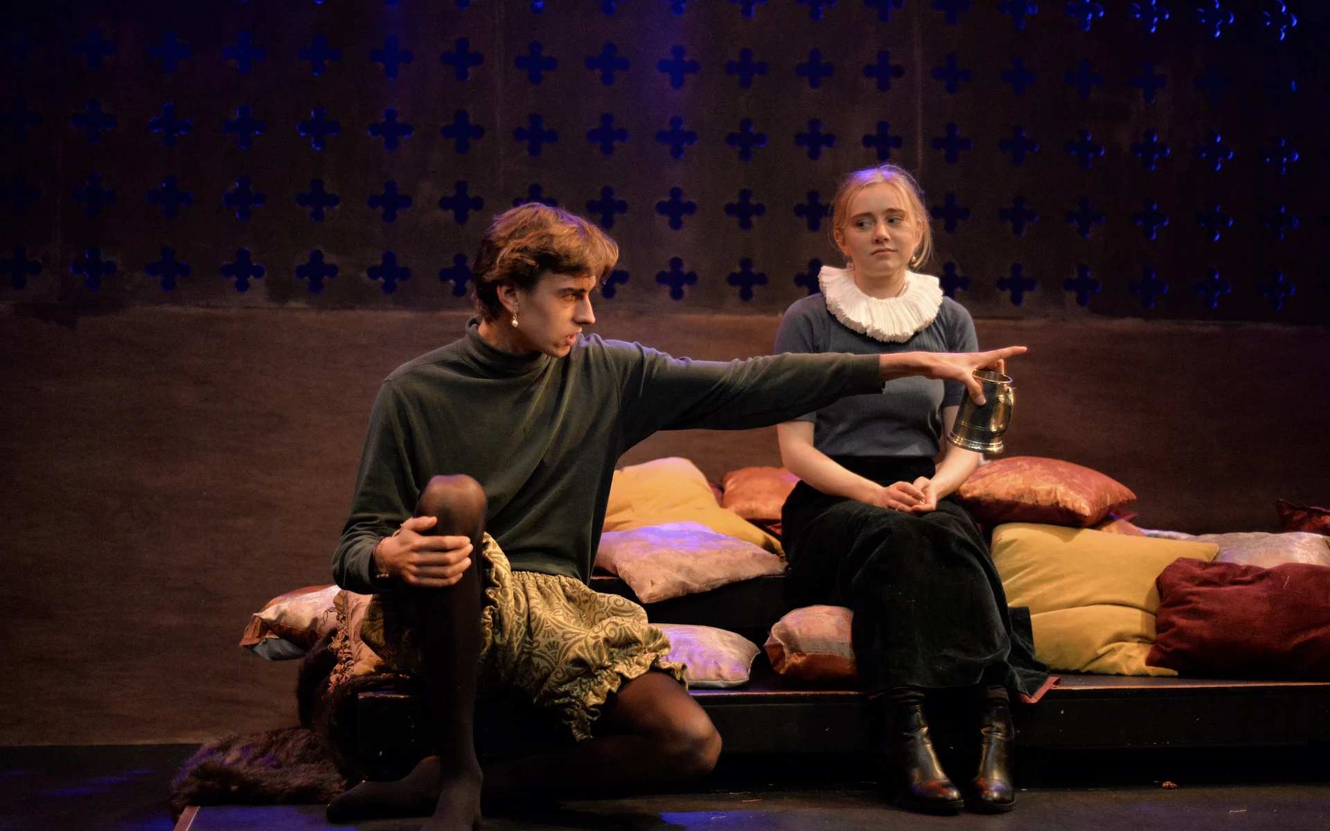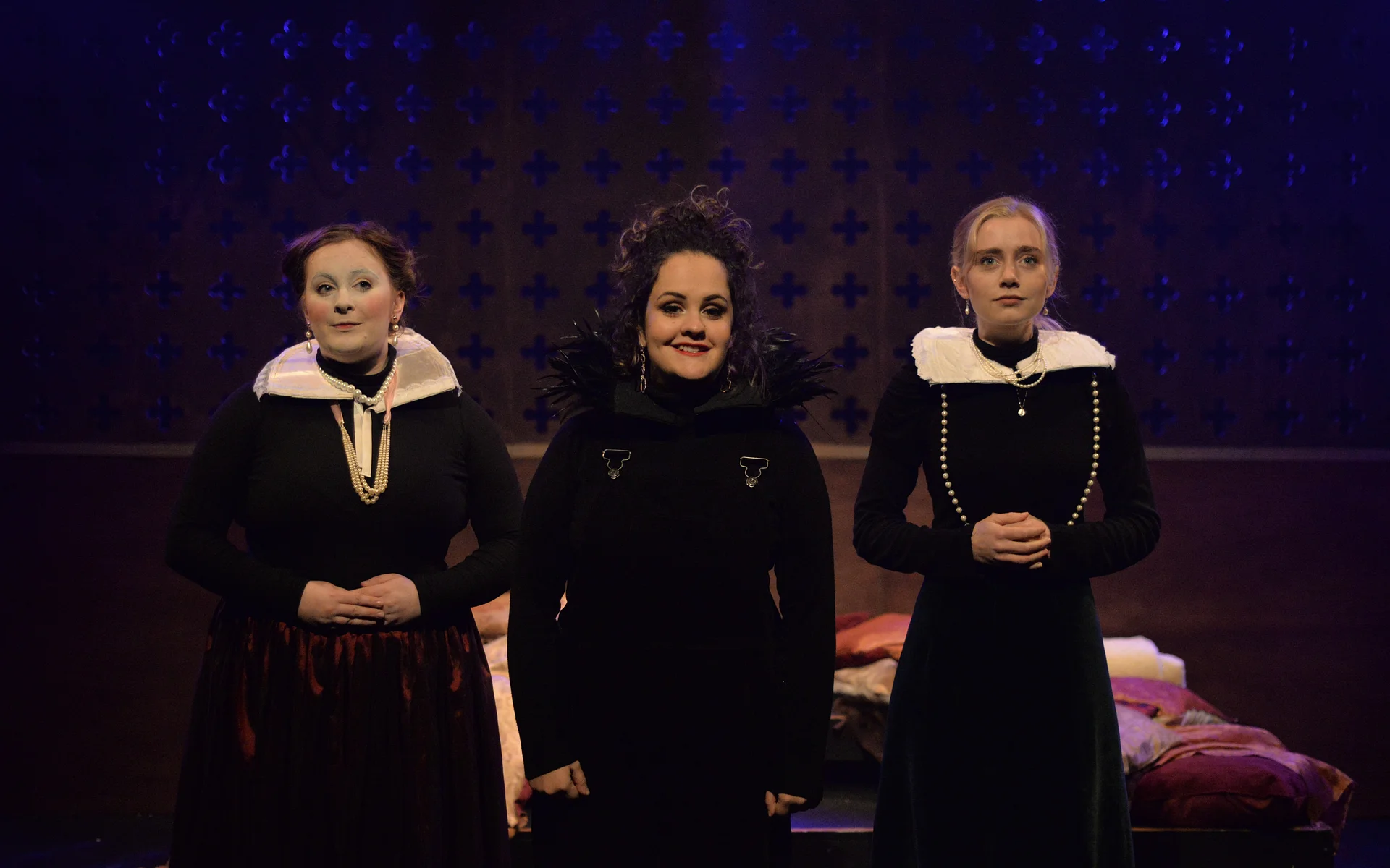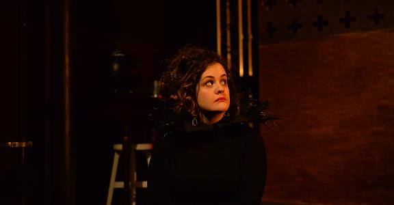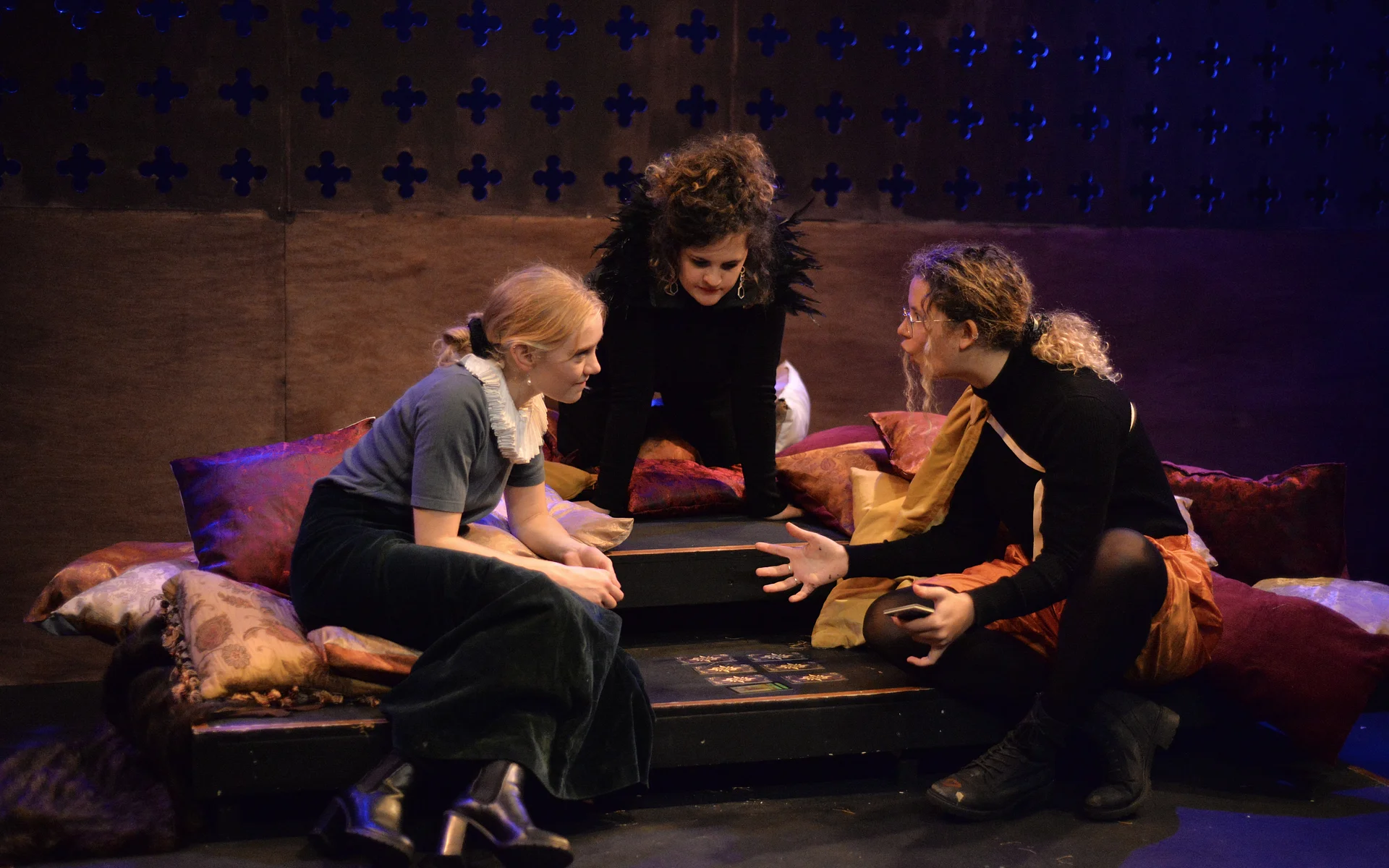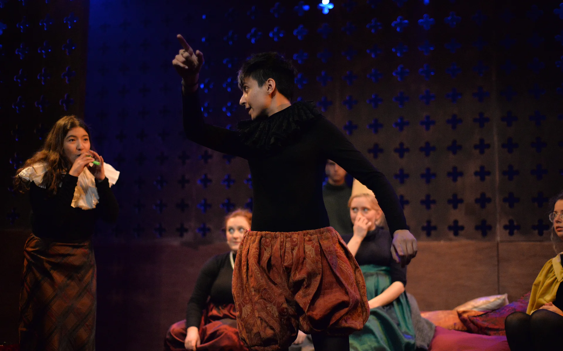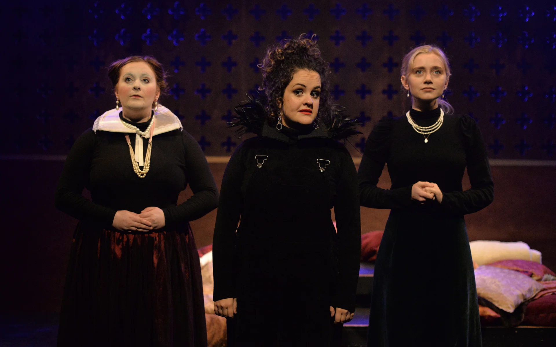 Indeed, Matthew Marshland’s clever design that makes great use of the Bedlam space, allowing the players to come right out into the audience so they are, at times, addressing them directly from the front row. It is lit with a great sense of atmosphere by Elissa Webb.