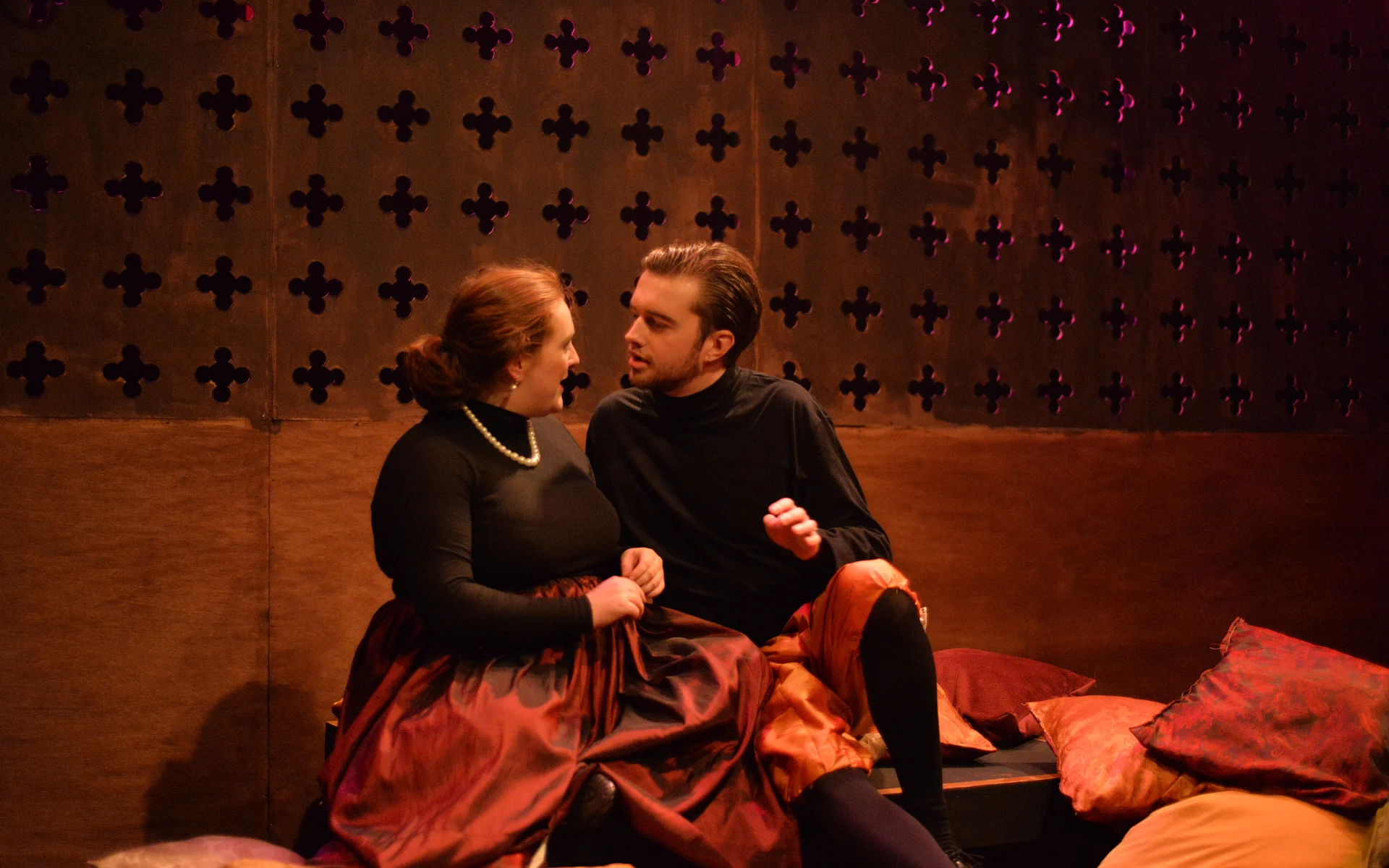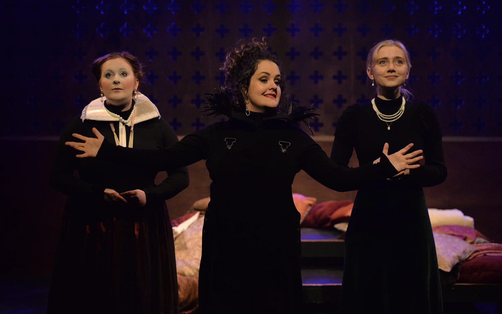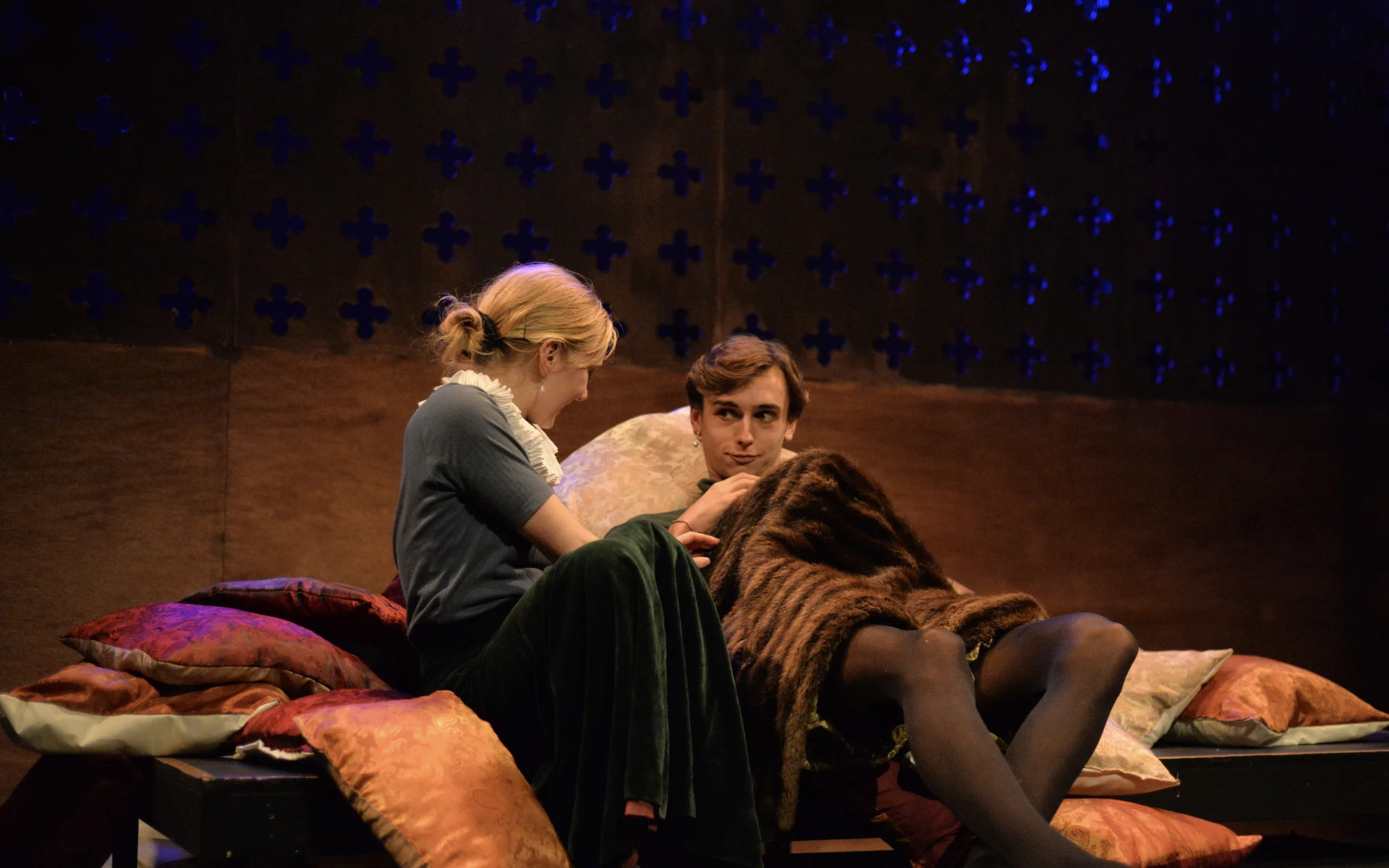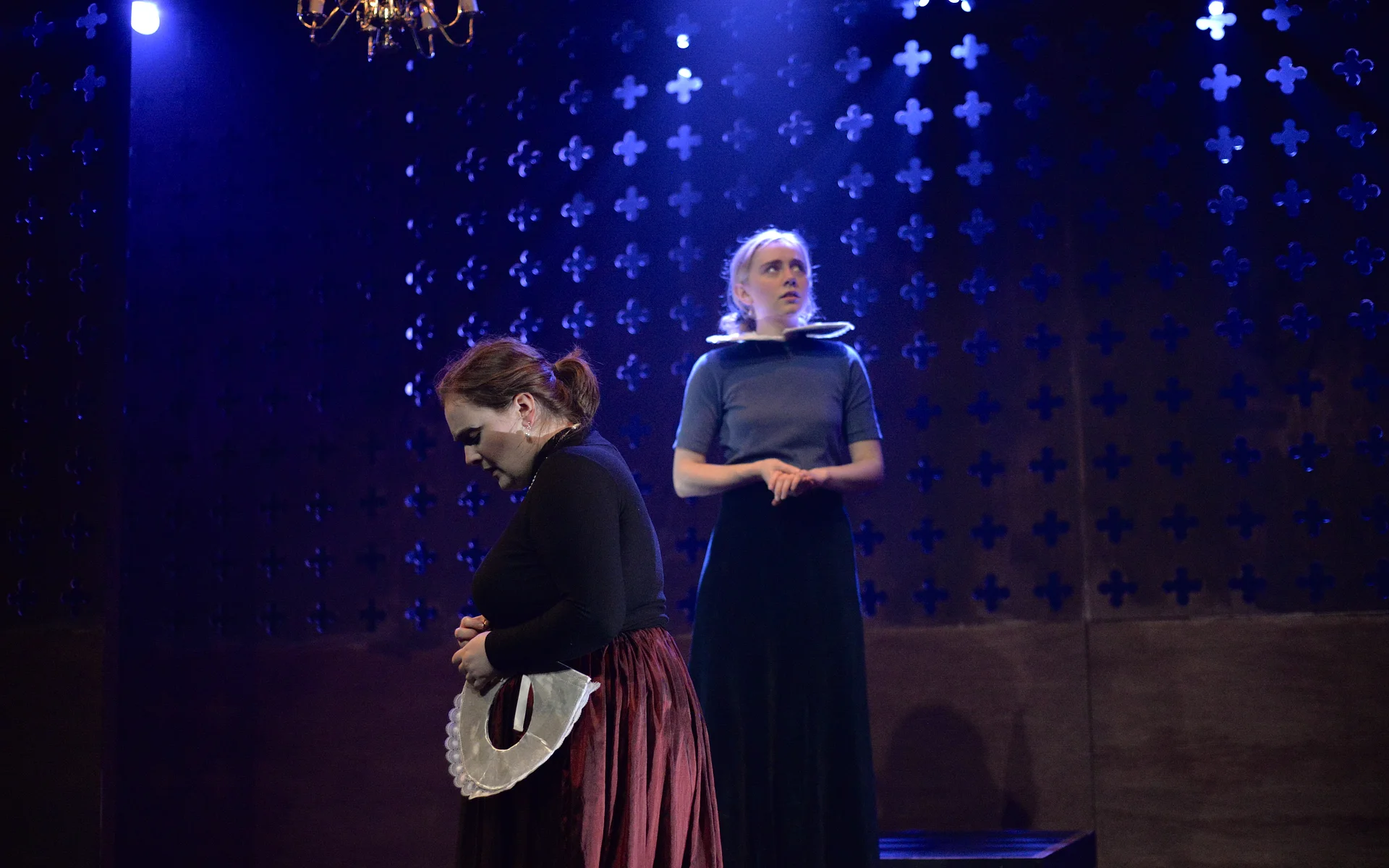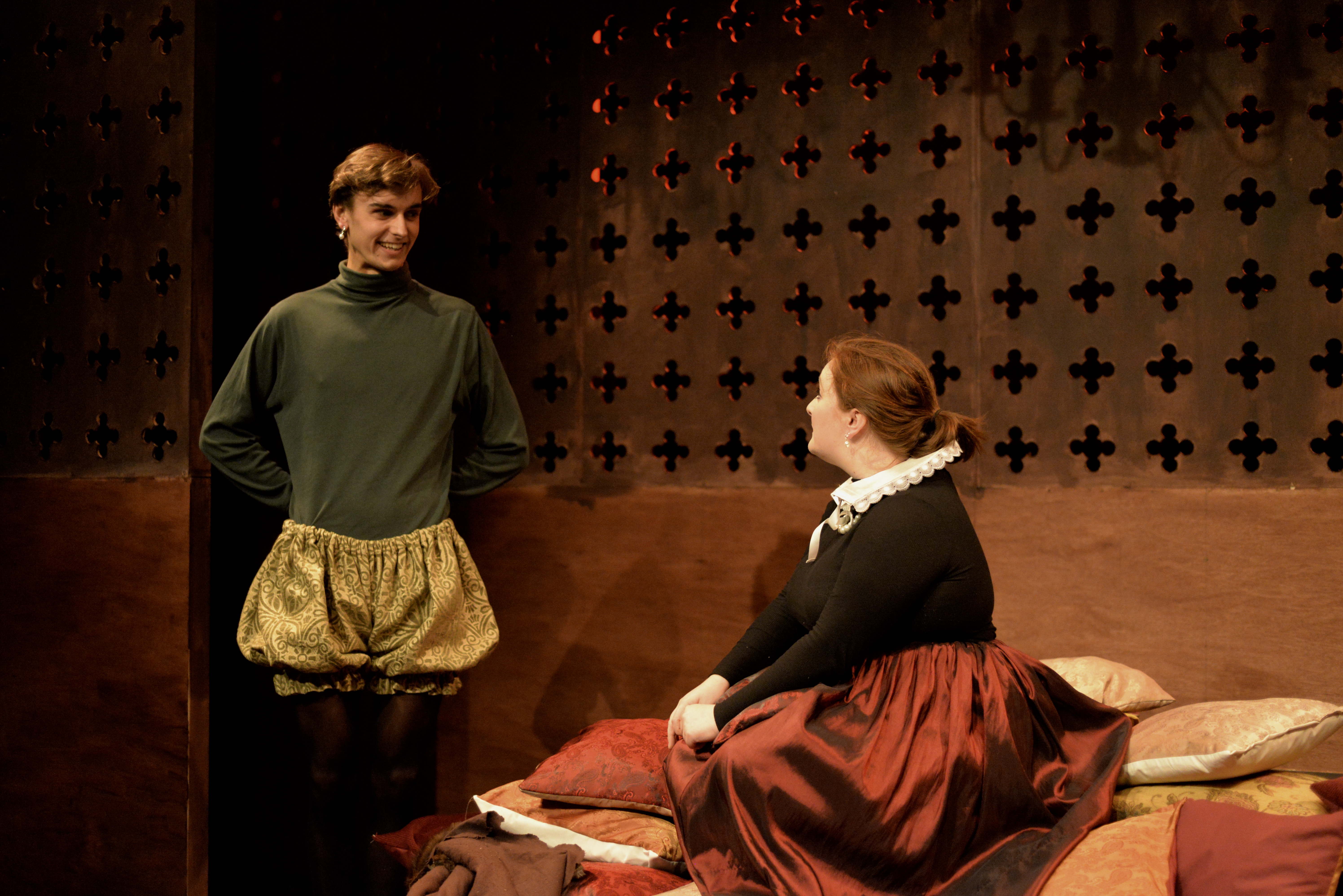 Indeed, Matthew Marshland’s clever design that makes great use of the Bedlam space, allowing the players to come right out into the audience so they are, at times, addressing them directly from the front row. It is lit with a great sense of atmosphere by Elissa Webb.