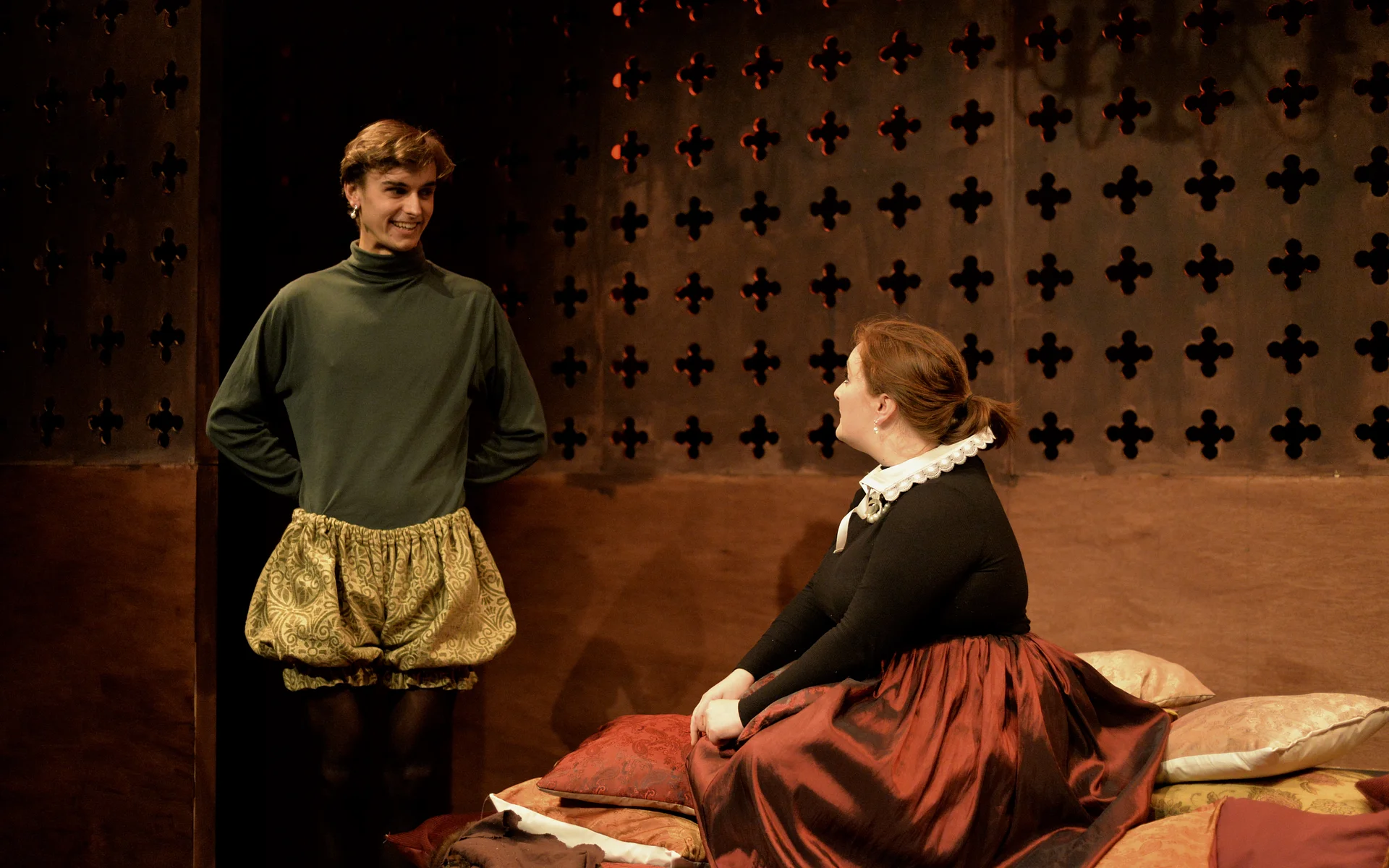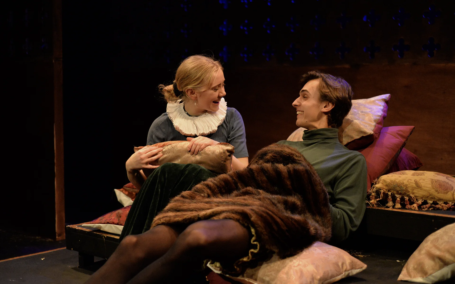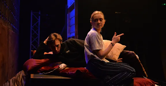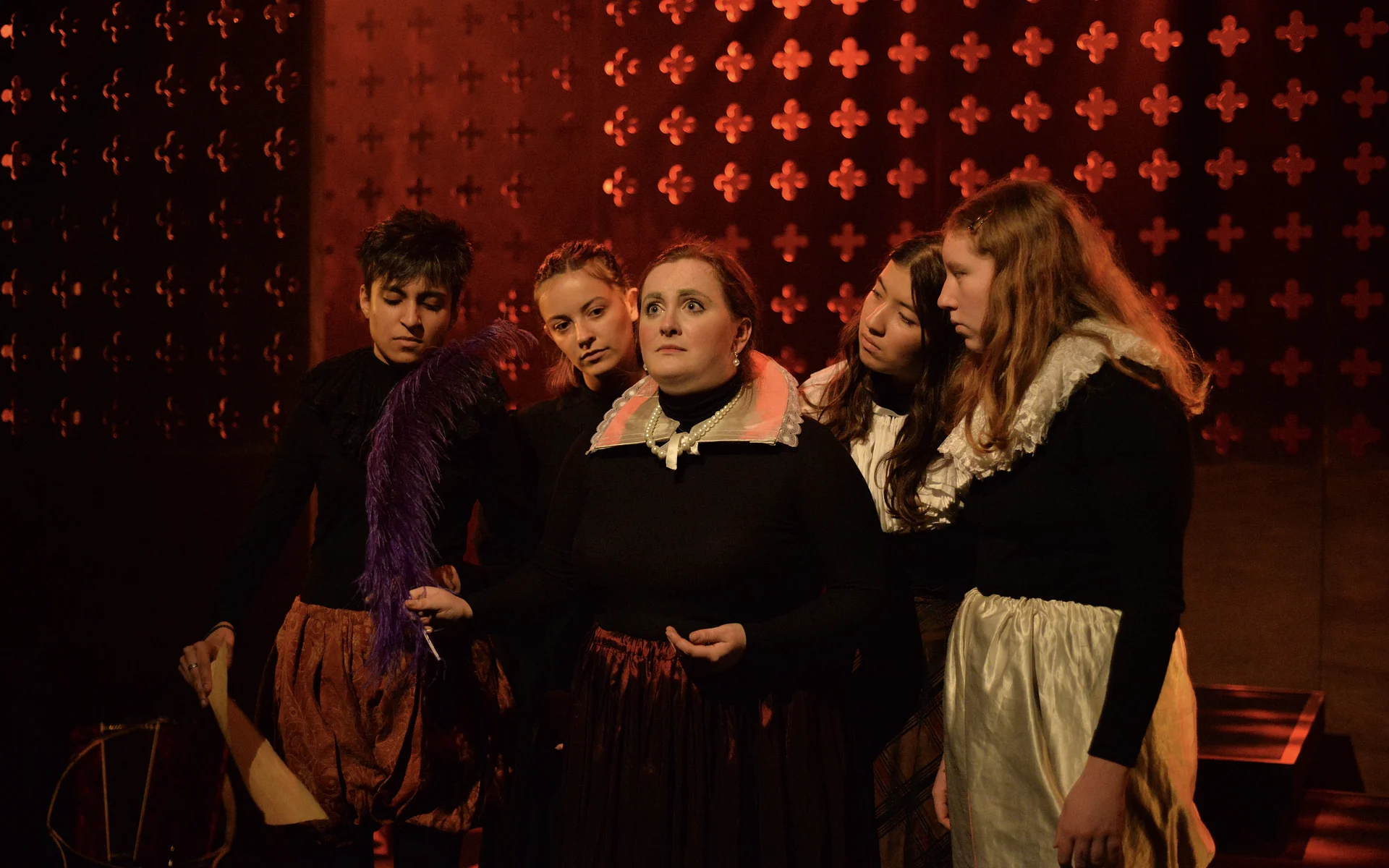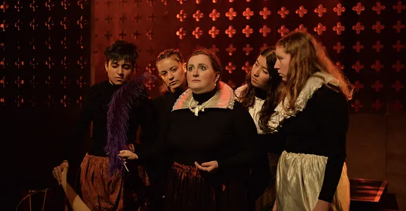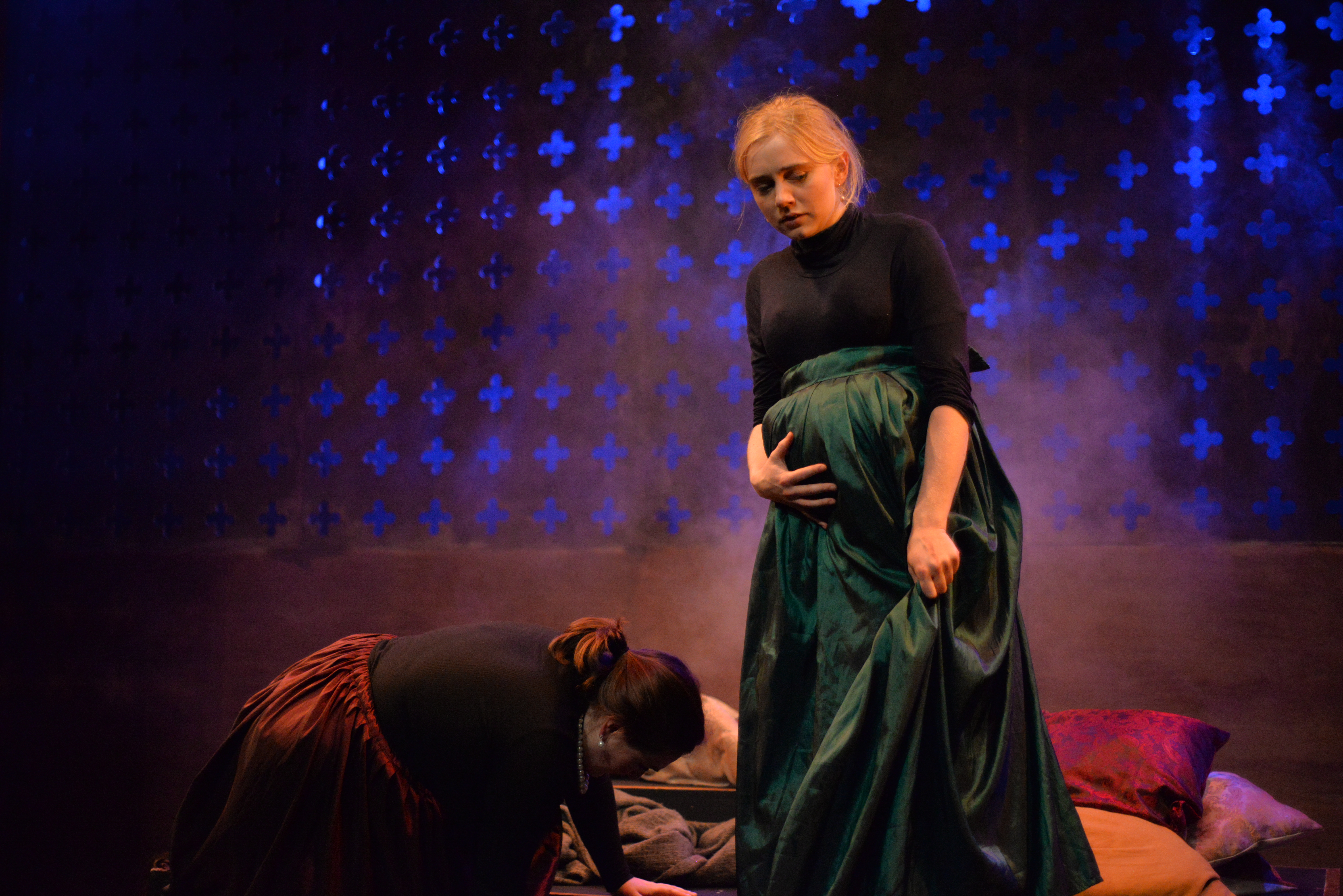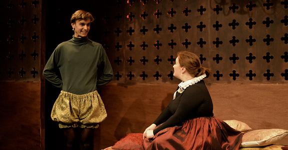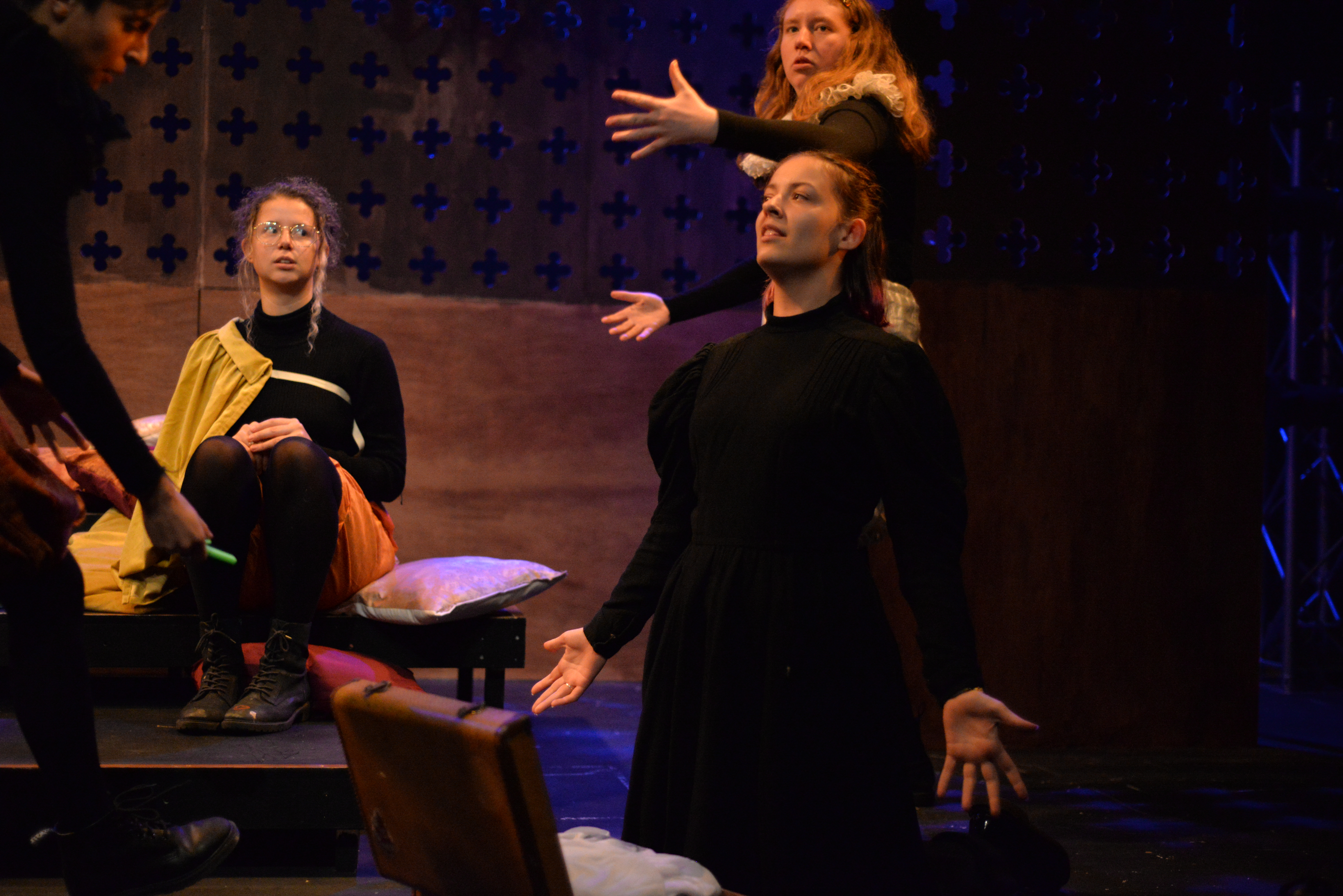 Indeed, Matthew Marshland’s clever design that makes great use of the Bedlam space, allowing the players to come right out into the audience so they are, at times, addressing them directly from the front row. It is lit with a great sense of atmosphere by Elissa Webb.