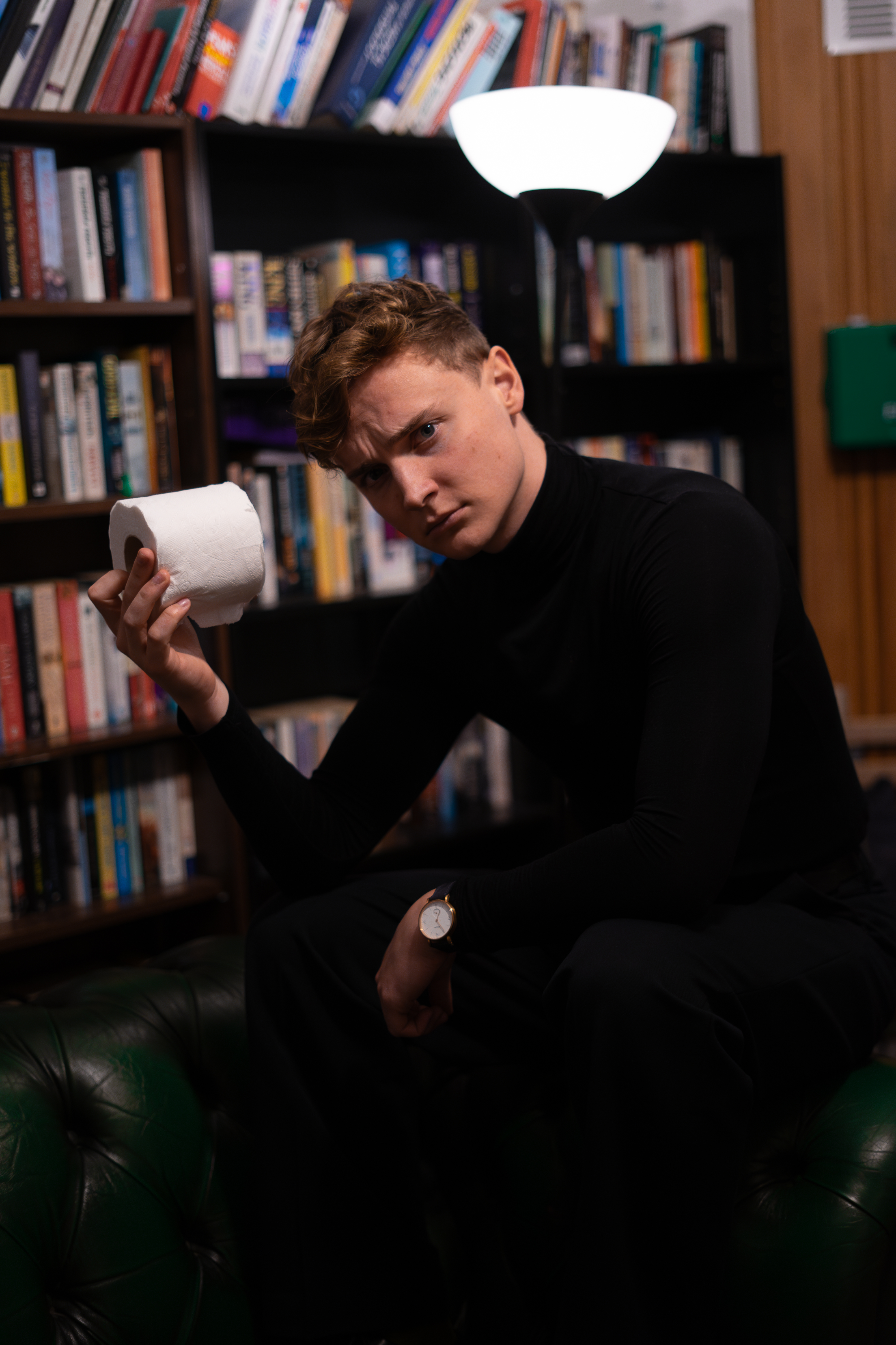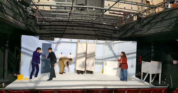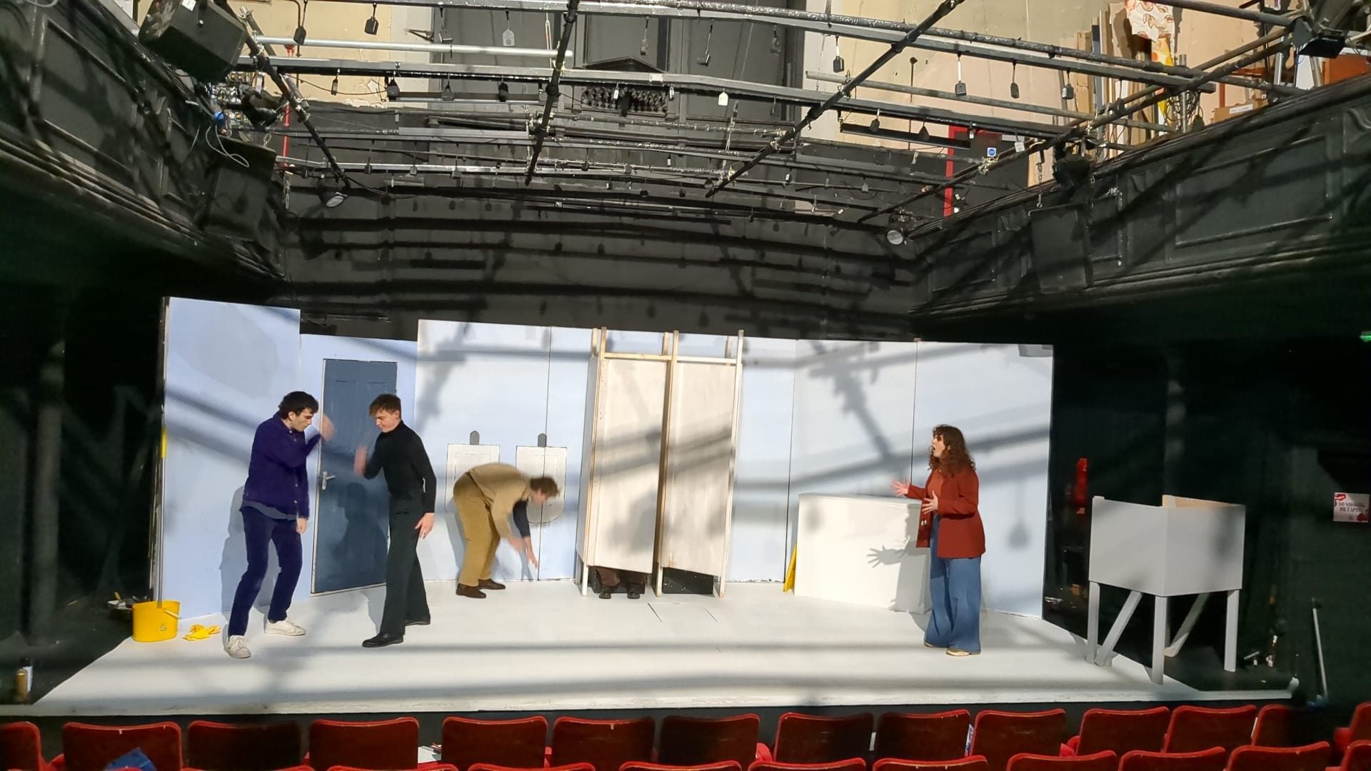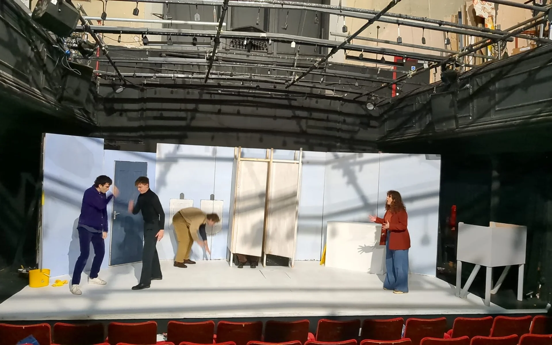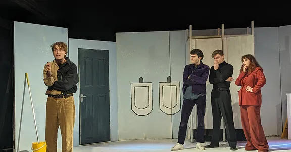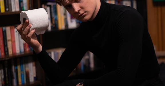 Nevertheless, in such a fast-paced, plot-driven play, it is understandable that Turnbull’s characters hinge on archetypes. Owen’s apparent death catapults the narrative into an absurd whodunit, opening up the story to an entrance from the inscrutable Alex, played with understated menace by Charlie Mitchell. The four characters revolve around the space almost like a carousel, dropping each other off at points of suspicion, seemingly prepared to stab each other in the back if it means clearing their name. Cross keeps these moments dynamic, sectioning the space so that tribalistic, polarised points are built into the geography of the bathroom, converting it, briefly, into a battleground.