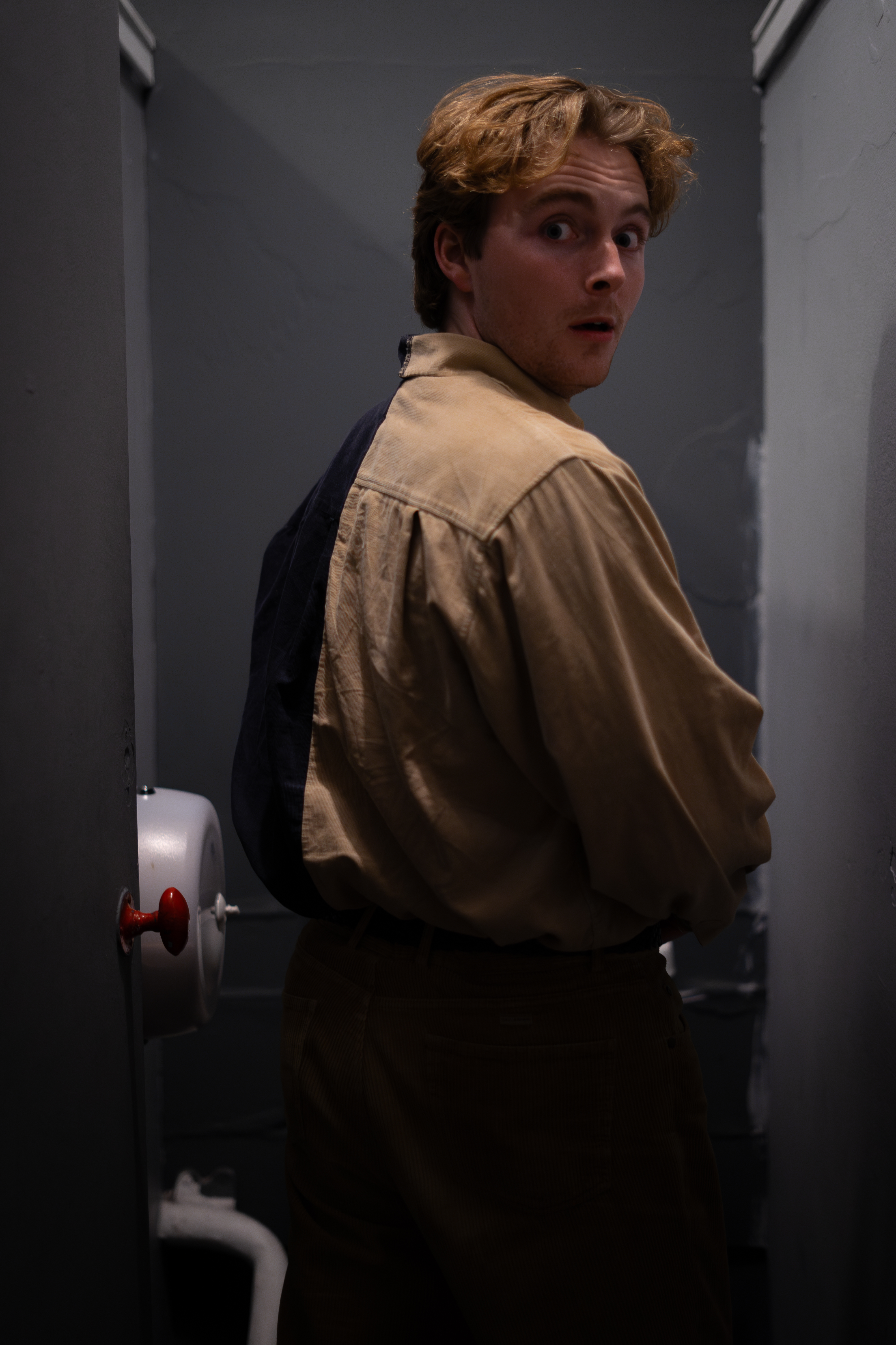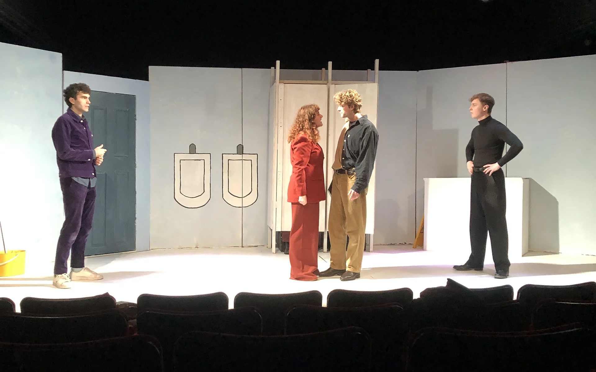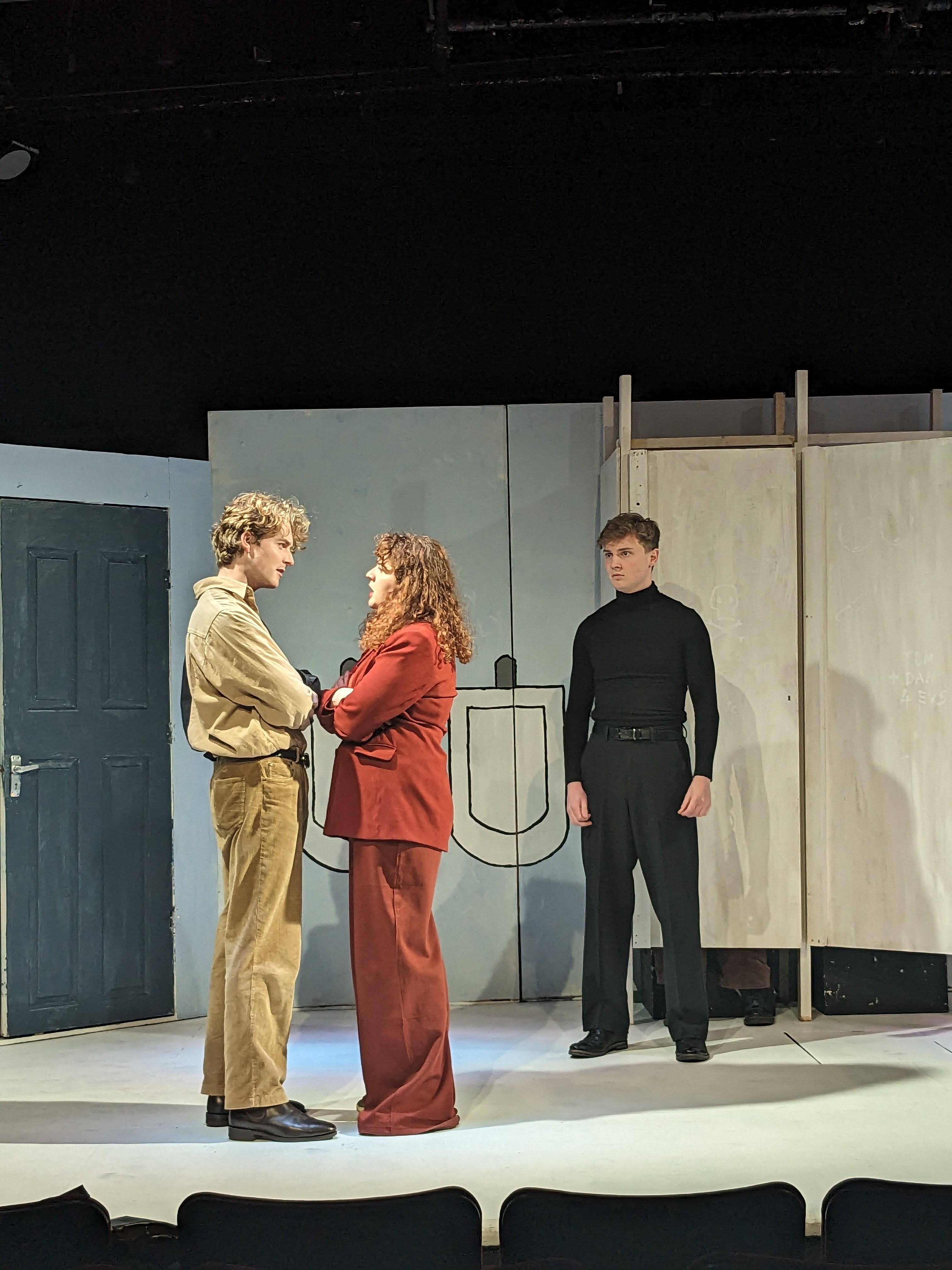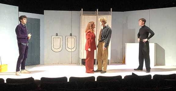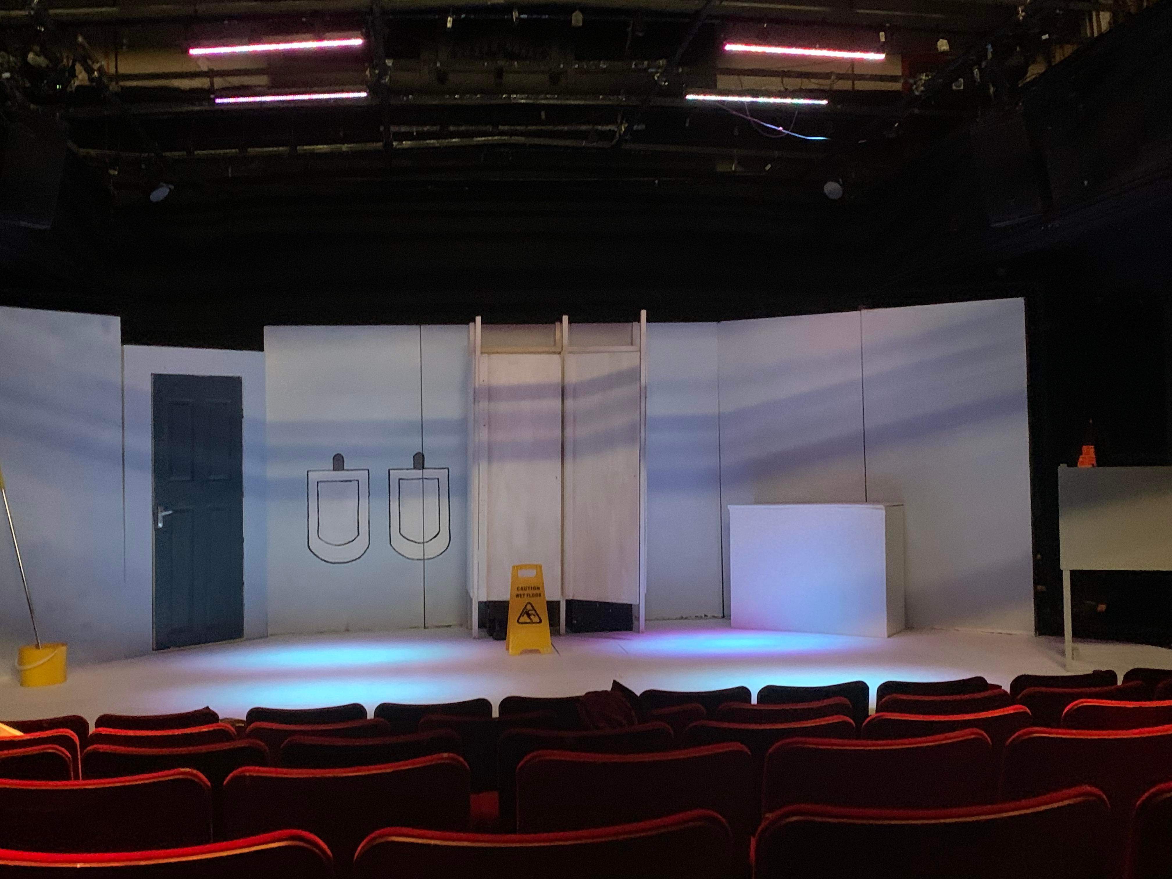 The quippy remarks paint a family portrait gone wild; Danny is the slightly air-headed, abandonment-fearing youngest; Tom is the attention-seeking middle child, and Billie, the oldest, is the pragmatic ringleader. Despite some unsuccessful attempts to add sexual tension between Billie and Tom, there is an anchored dynamic which all three characters seem to exist and grow from. Not forgetting the apparently high, stolid voice of Owen, the fourth, tragic component of the group, locked in the cubicle adjacent to Billie’s. Despite Owen’s impassive groaning, the setting comes to life when all three reminisce, with Maley’s characters’ backstory proving the most surprising, and the most interesting, having used the boy’s bathroom as a means of hiding from her mother, the headmistress, not much is done with this plot point, which is a shame, as it may have proven useful in connecting elements of wider relationships, and plot.