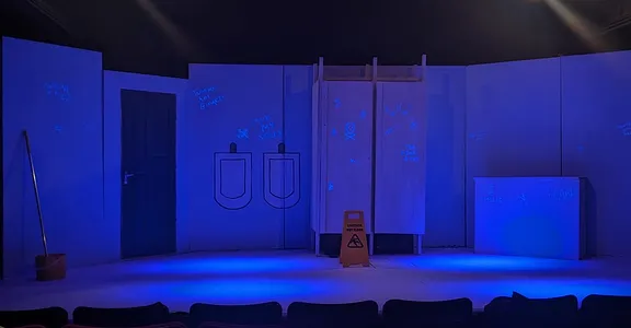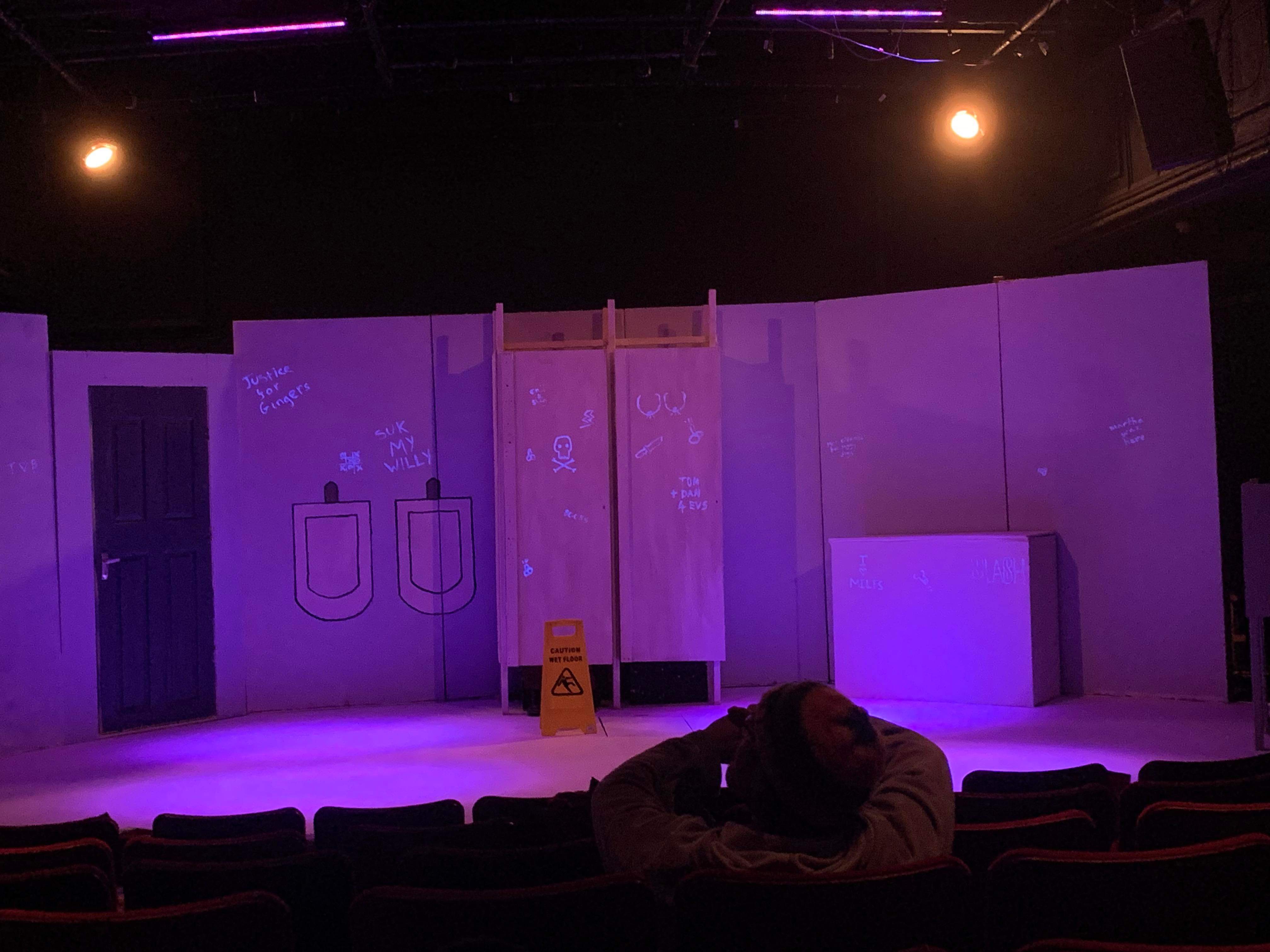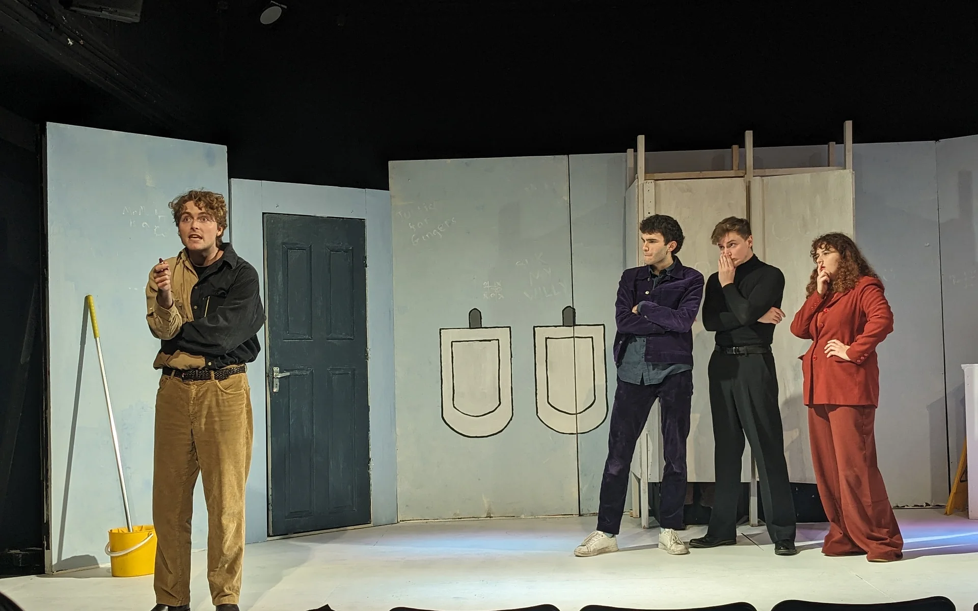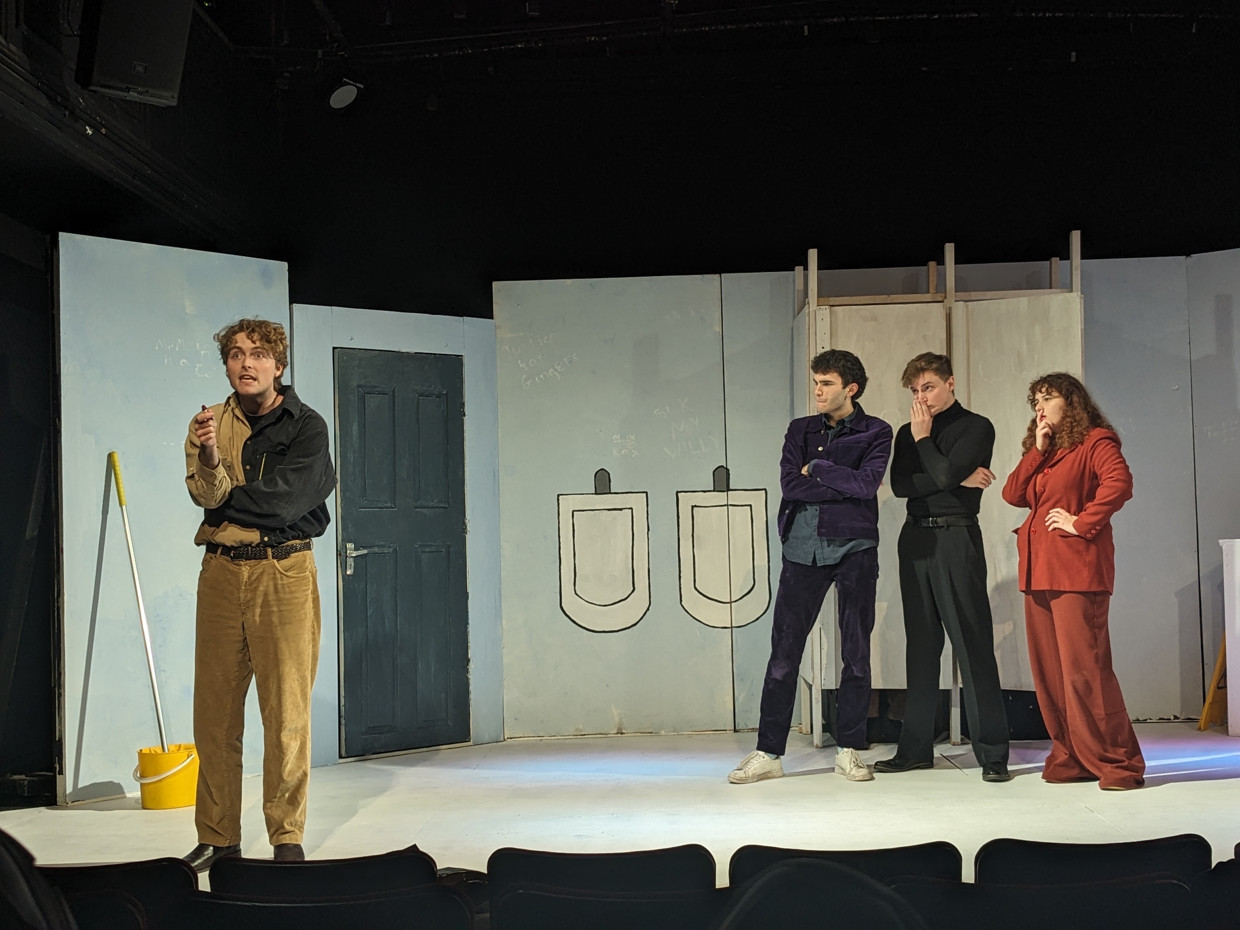 Walking into Bedlam, squinting to read the lascivious words graffitied on the ‘walls’, with Ricky Nelson’s tragically solemn-sounding ‘Lonesome Town’ ringing, I had, admittedly, some doubts as to the nature of what I was about to experience – a tragicomic whodunit rooted in a room which, despite my fairly a limited experience in, I couldn’t help but associate with bad smells, bad hygiene, and, frankly, preferably avoidable sights of sexual organs, is quite a niche to develop a compelling story from. And, though my misgivings regarding scatological references and piss jokes proved well-founded, the relationships which surfaced were sufficiently witty to familiarise the audience with such an unfamiliar space.