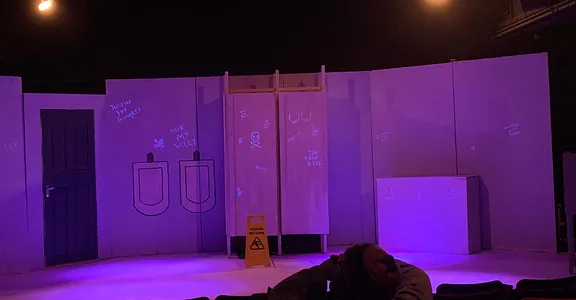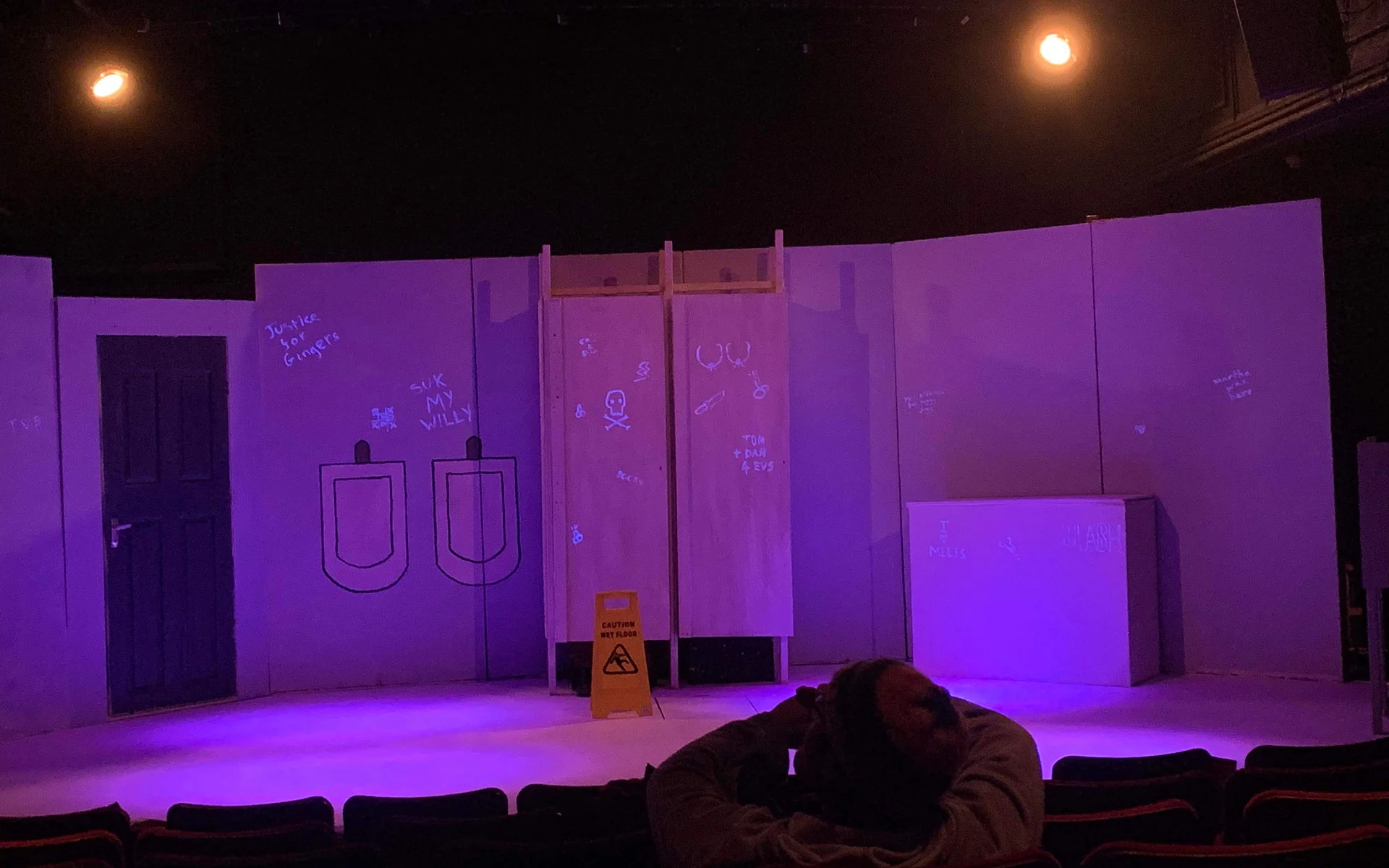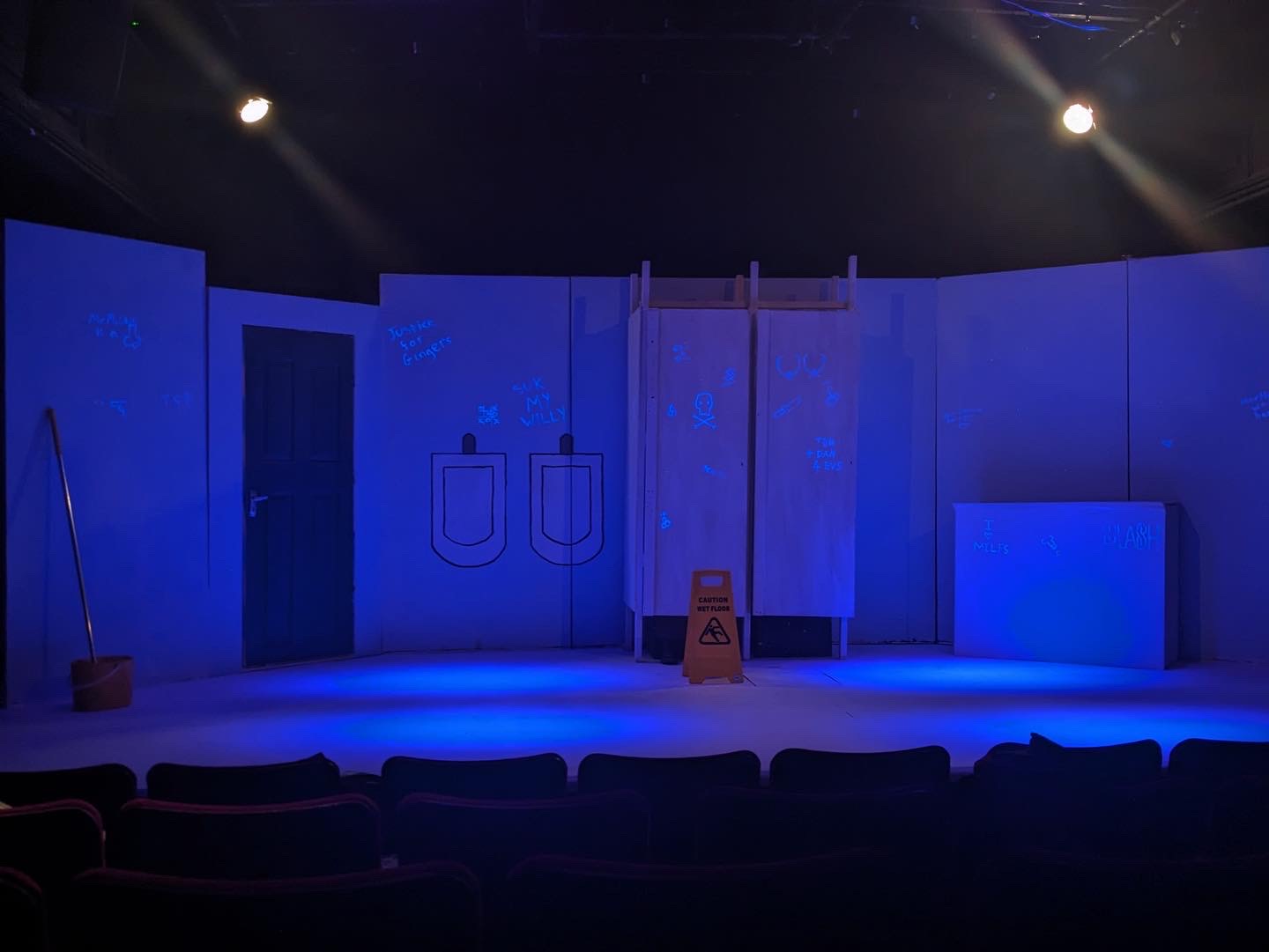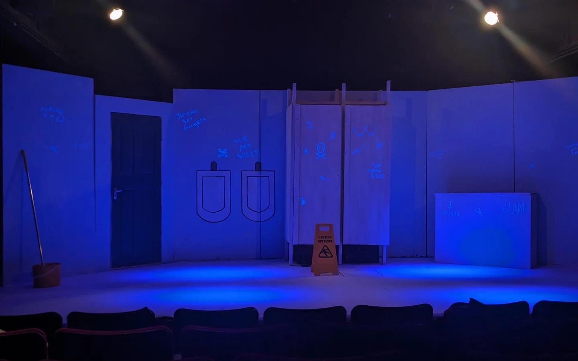 Walking into Bedlam, squinting to read the lascivious words graffitied on the ‘walls’, with Ricky Nelson’s tragically solemn-sounding ‘Lonesome Town’ ringing, I had, admittedly, some doubts as to the nature of what I was about to experience – a tragicomic whodunit rooted in a room which, despite my fairly a limited experience in, I couldn’t help but associate with bad smells, bad hygiene, and, frankly, preferably avoidable sights of sexual organs, is quite a niche to develop a compelling story from. And, though my misgivings regarding scatological references and piss jokes proved well-founded, the relationships which surfaced were sufficiently witty to familiarise the audience with such an unfamiliar space.