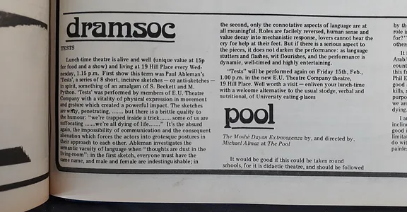 A series of 8 short, incisive sketches - or antisketches0 in spirit, something of an amalgam of S. Beckett and M. Python.
