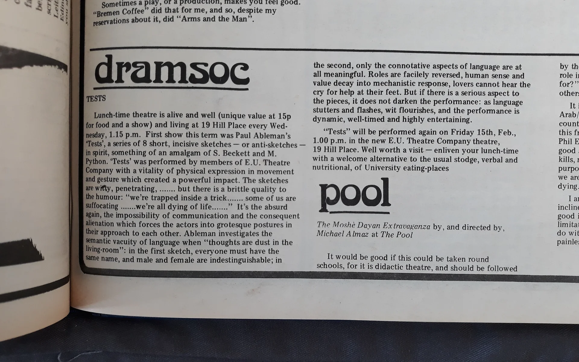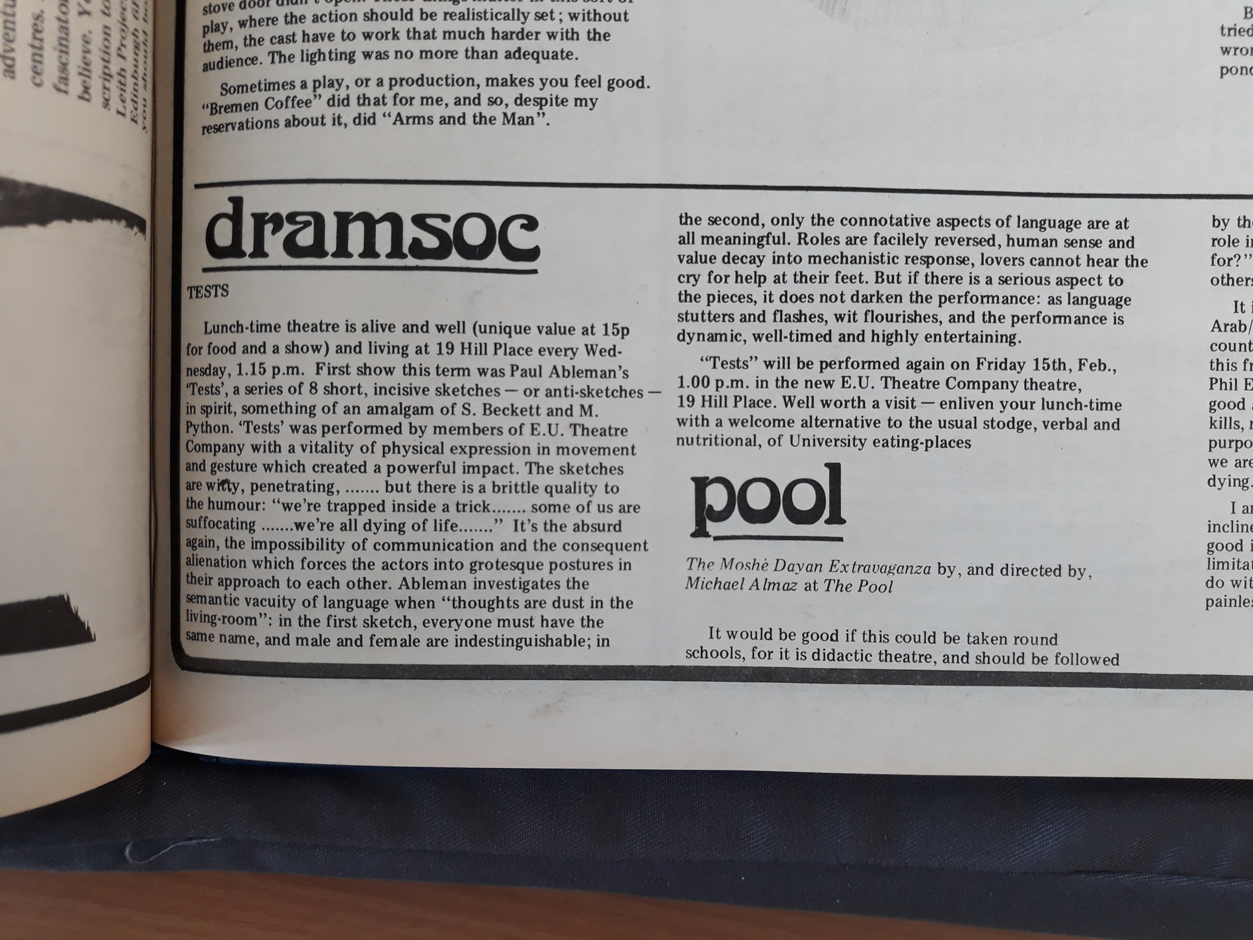 A series of 8 short, incisive sketches - or antisketches0 in spirit, something of an amalgam of S. Beckett and M. Python.