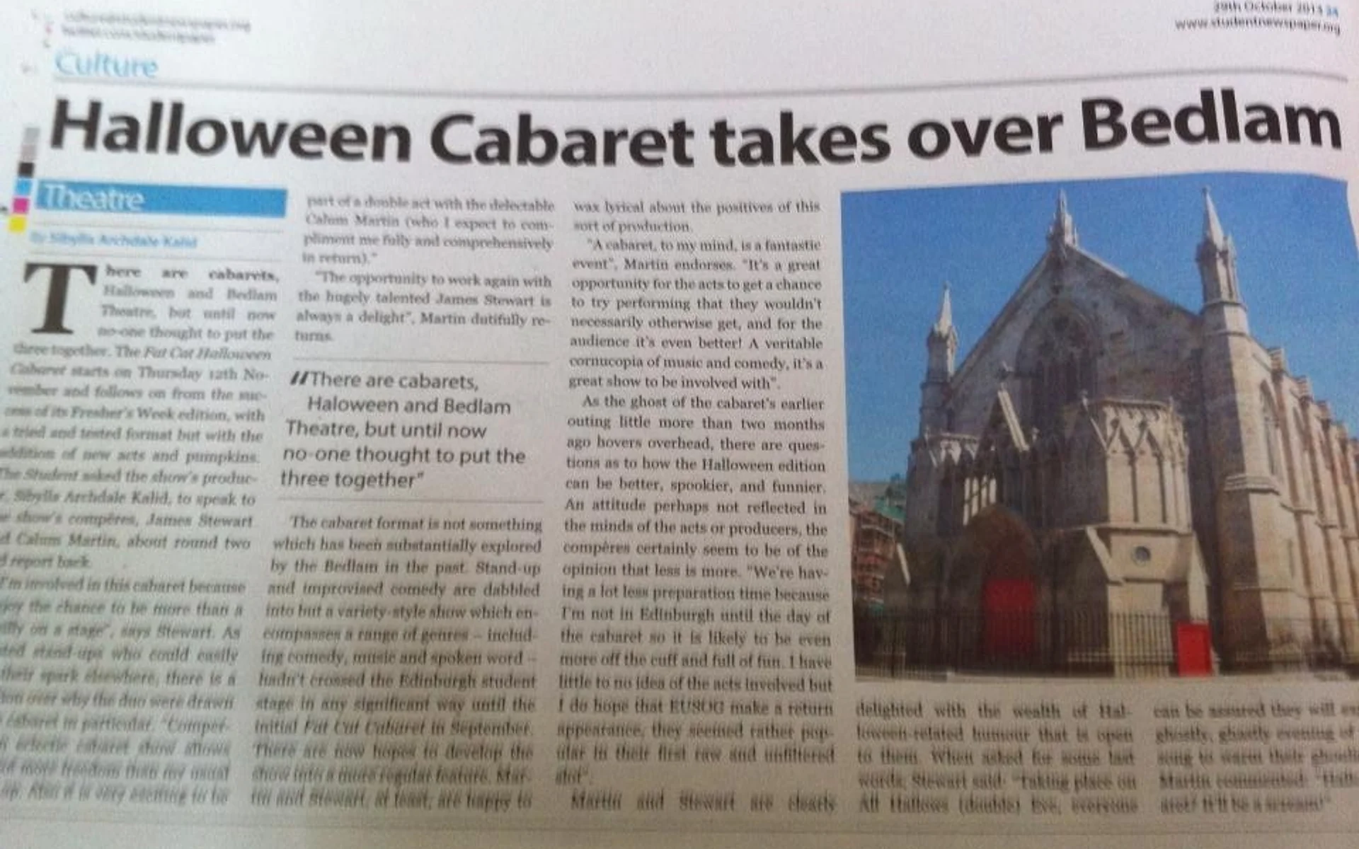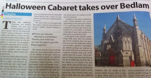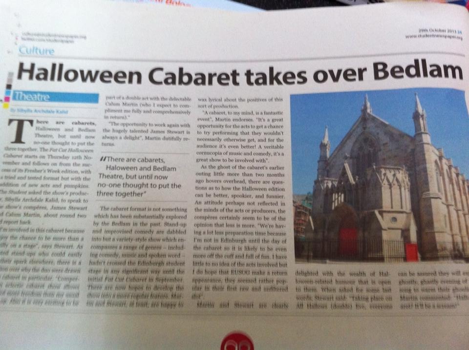 Returning for a special Halloween performance, Bedlam’s top-notch cabaret extravaganza is bigger than ever before. Armed with all the camp humour of the Hammer Horror back-catalogue, hosts James Stewart and Calum Martin will introduce a horrifically talented bunch of acts for your delectation. Expect some of the freshest comedy talent from the Edinburgh student scene, spoken word, song, dance and more! Anything goes at the Fat Cat Cabaret!