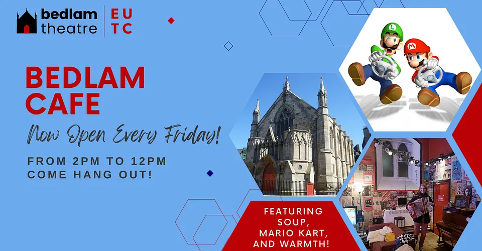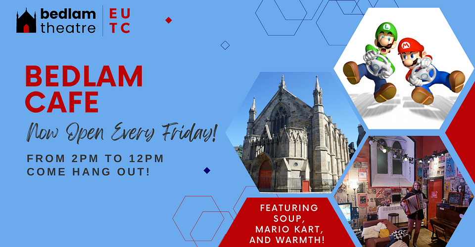 Each Friday, Bedlam Cafe will be open from 2pm to midnight! Come hang out and grab some soup, meet new people, play Mario Kart, study, or have a meeting. Drop in for however long/short you want! It’ll be a fun way to meet other people in the society, or just have a nice warm place to be. Mick with accordion not guaranteed
